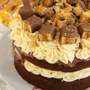 So I made these delicious little Honeycomb Crunchie Cupcakes back in June, and they have been SO popular. Like, I underestimated how much people would like these! Something about the delicious and light chocolate cupcakes, with the honey buttercream frosting, and the Crunchies of course, make a DELICIOUS and dreamy cupcake. So, after the success of them, and that they’ve been pinned over 10,000 times on Pinterest, I made a cake version.