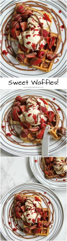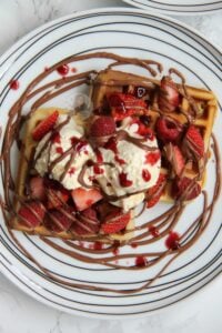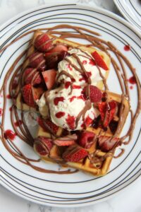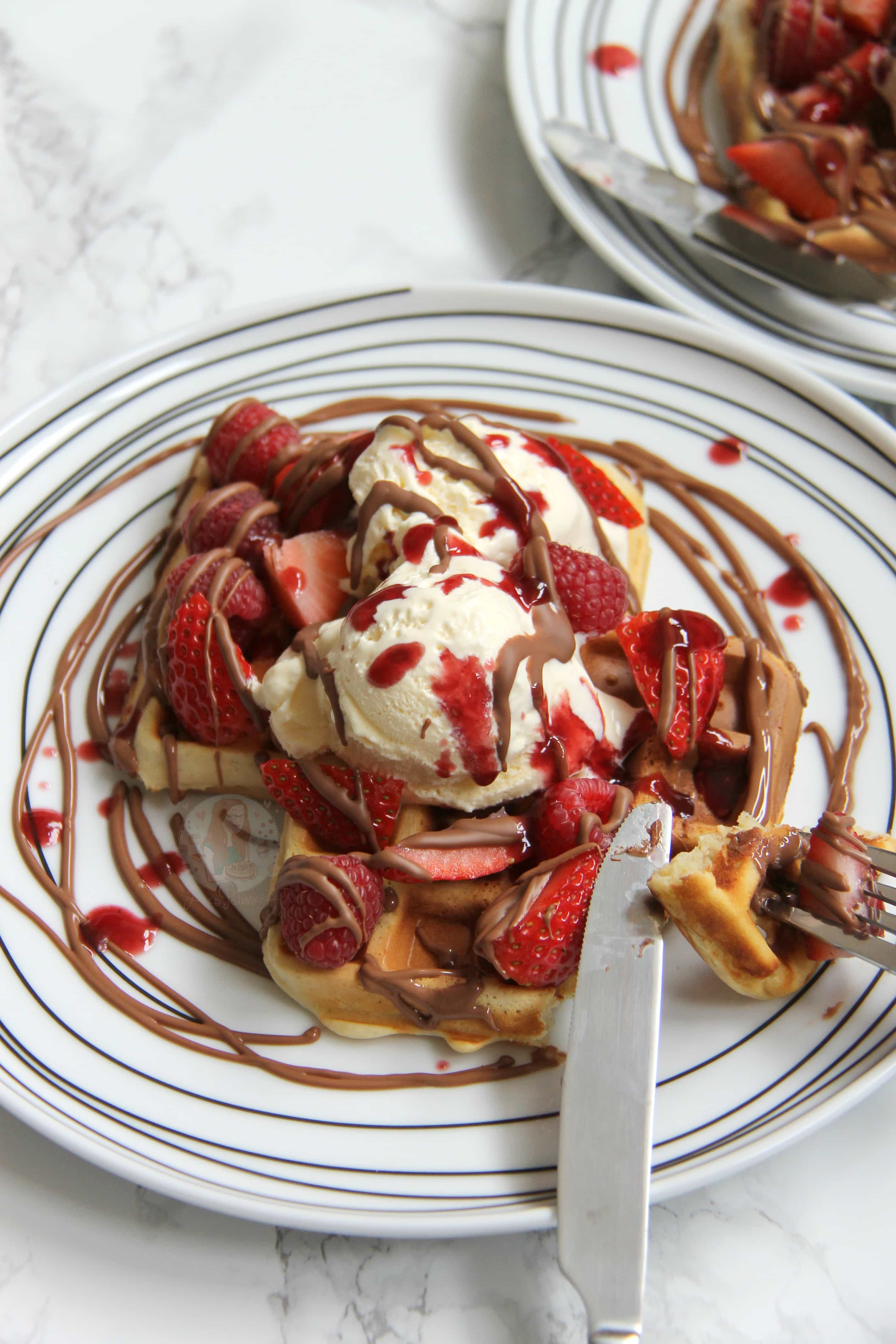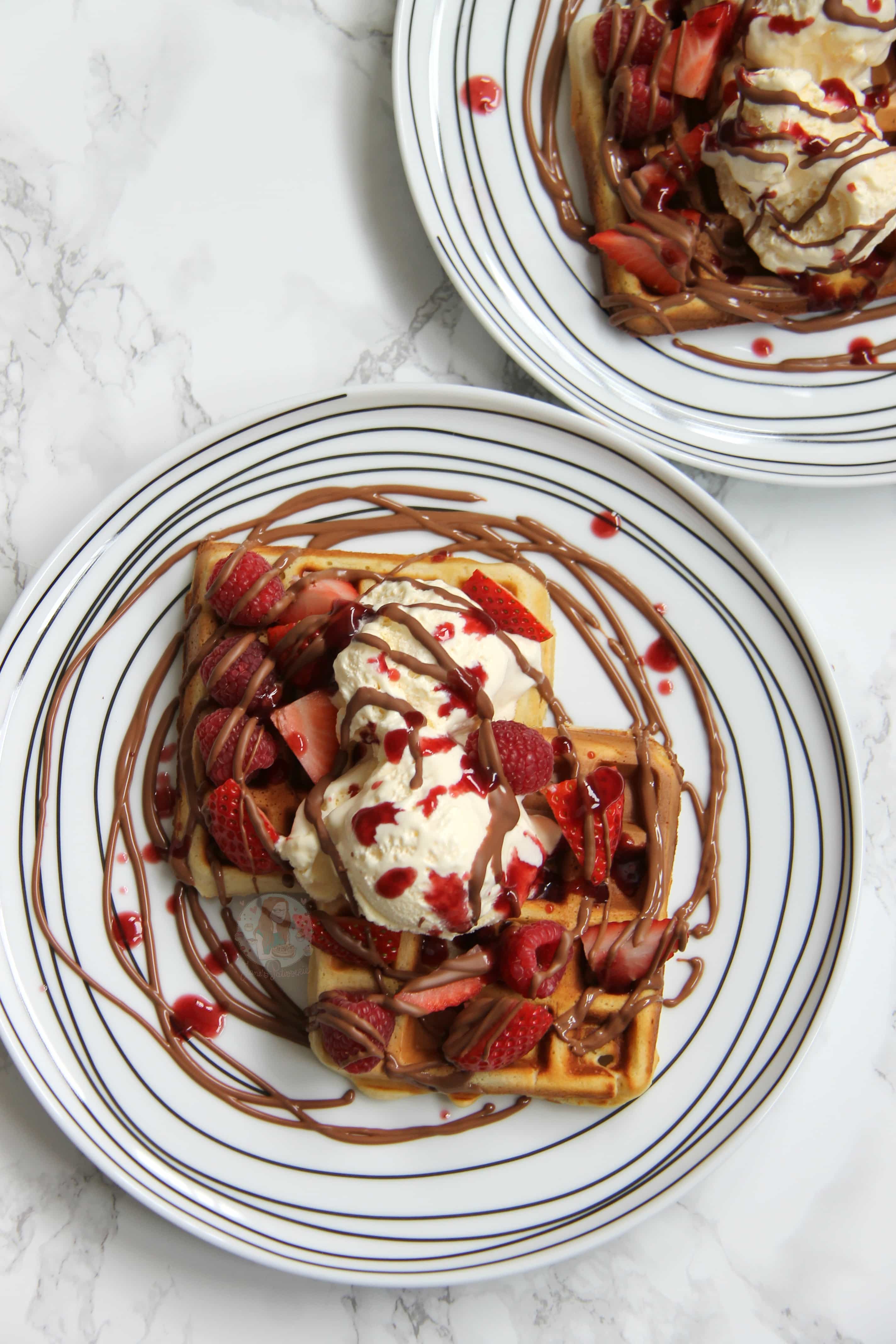 - Carefully take your waffles out of the machine, and serve how you like. I served mine with some Melted Chocolate, Clotted Cream Ice Cream, Strawberries, Raspberries, and some Raspberry Coulis! Enjoy!