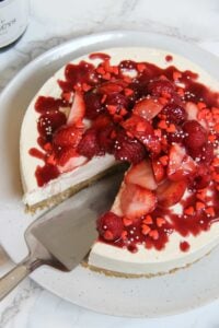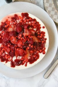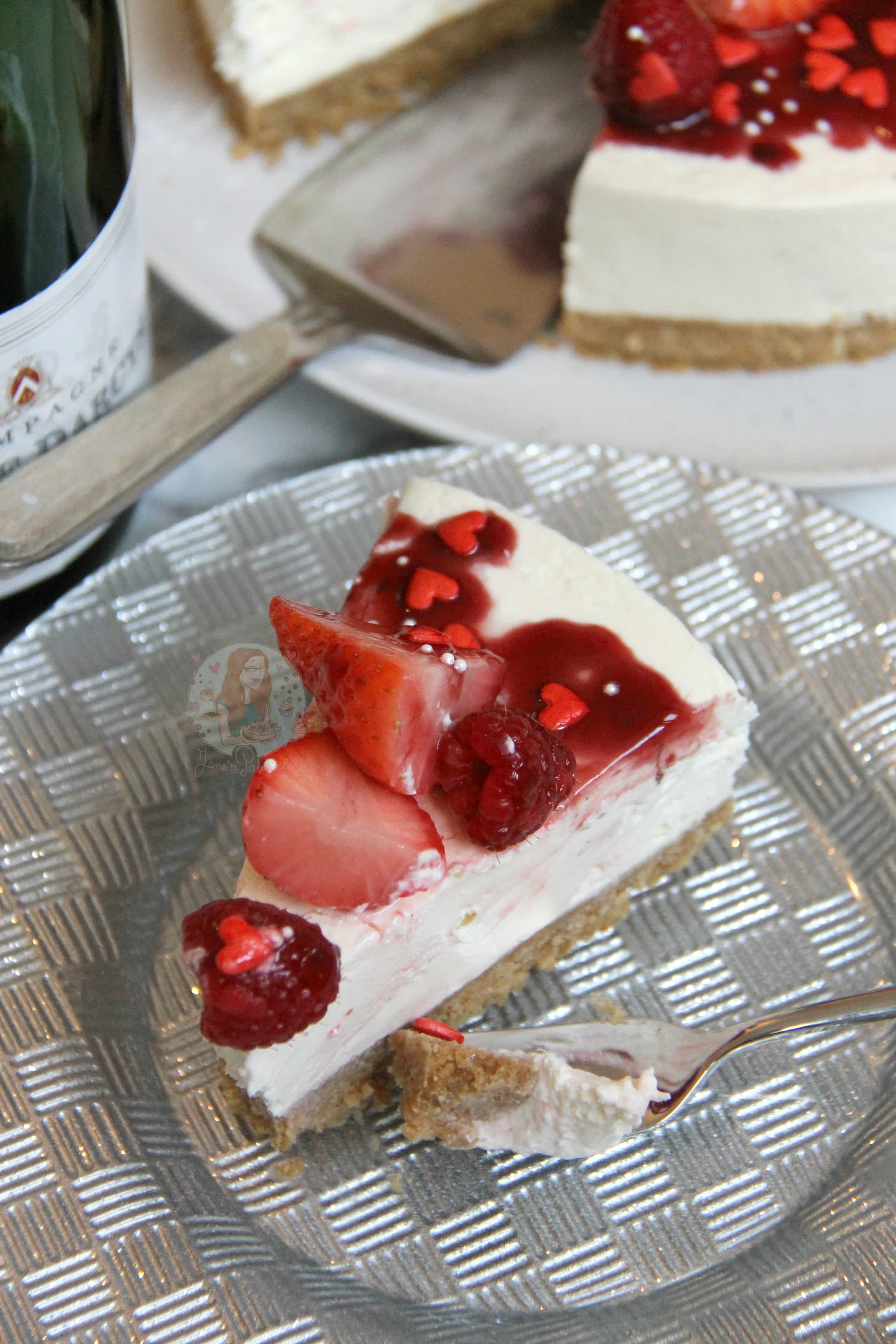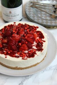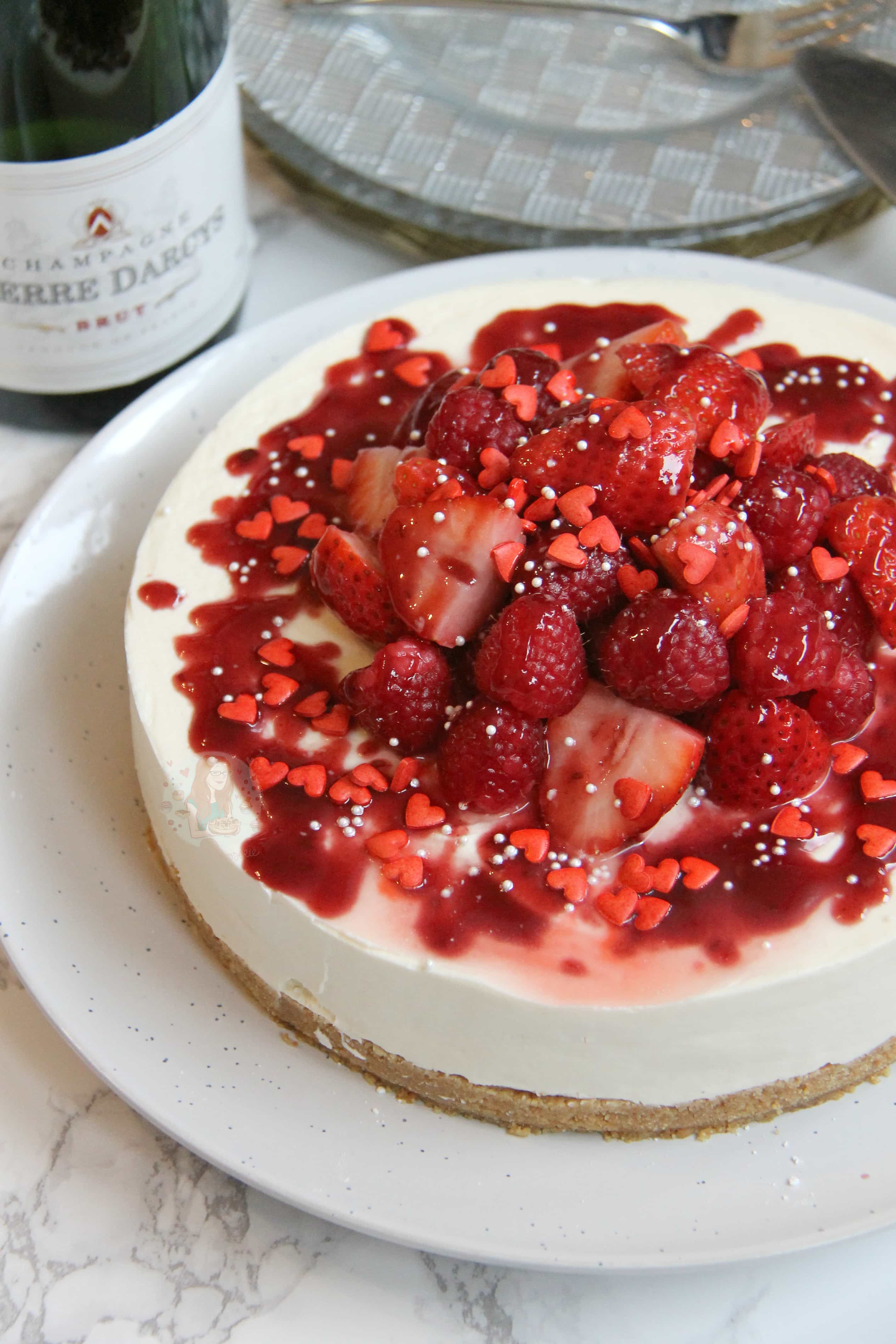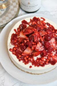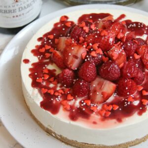• Carefully remove the cheesecake from the tin. Drain your champagne soaked berries and dry slightly with kitchen towel if they’re really damp still. Decorate your cheesecake with them. Drizzle over some fruit coulis, and any sprinkles you desire! Enjoy!