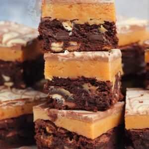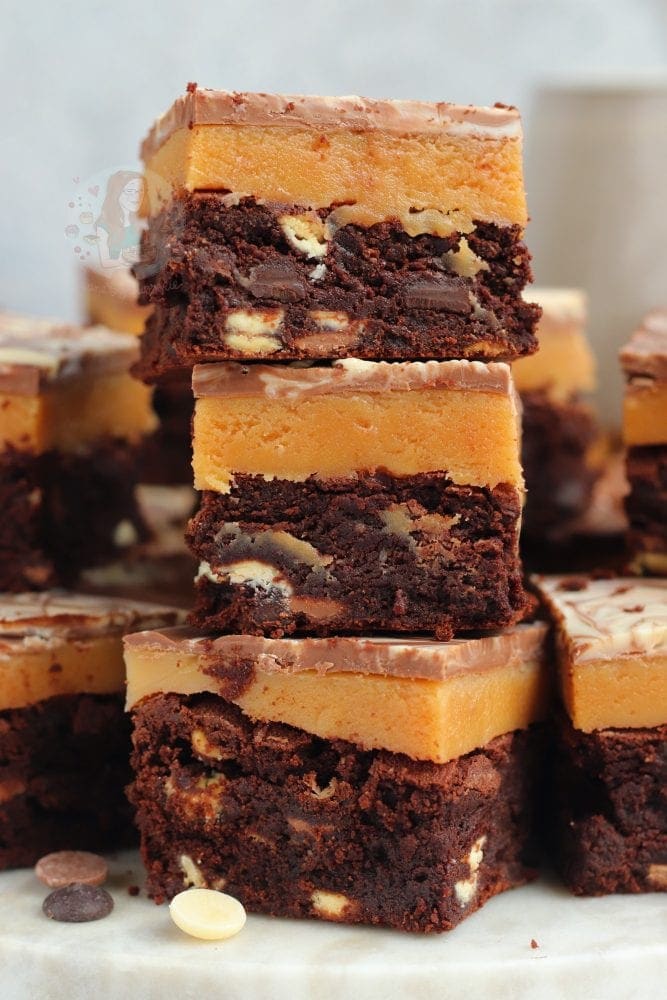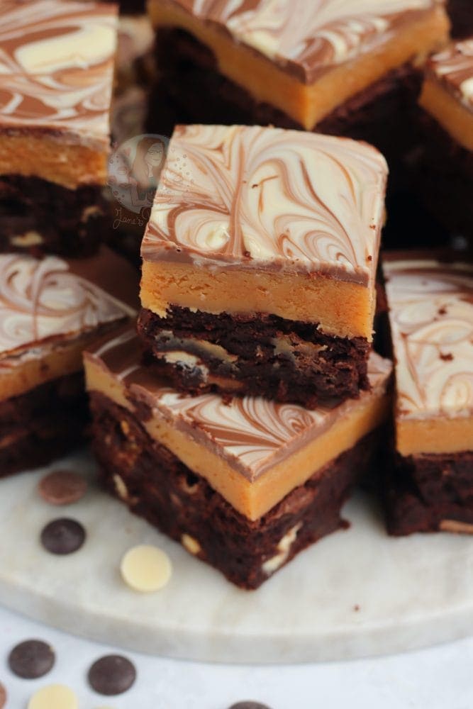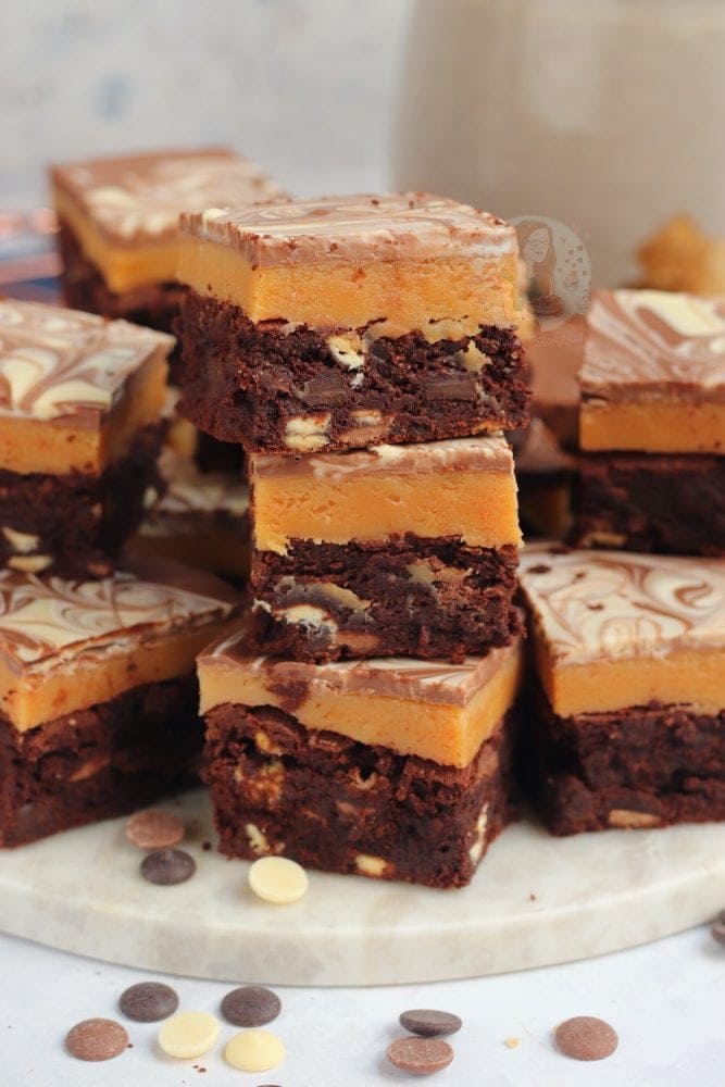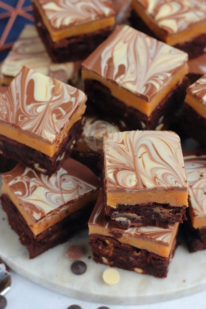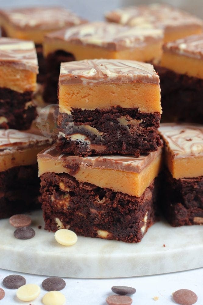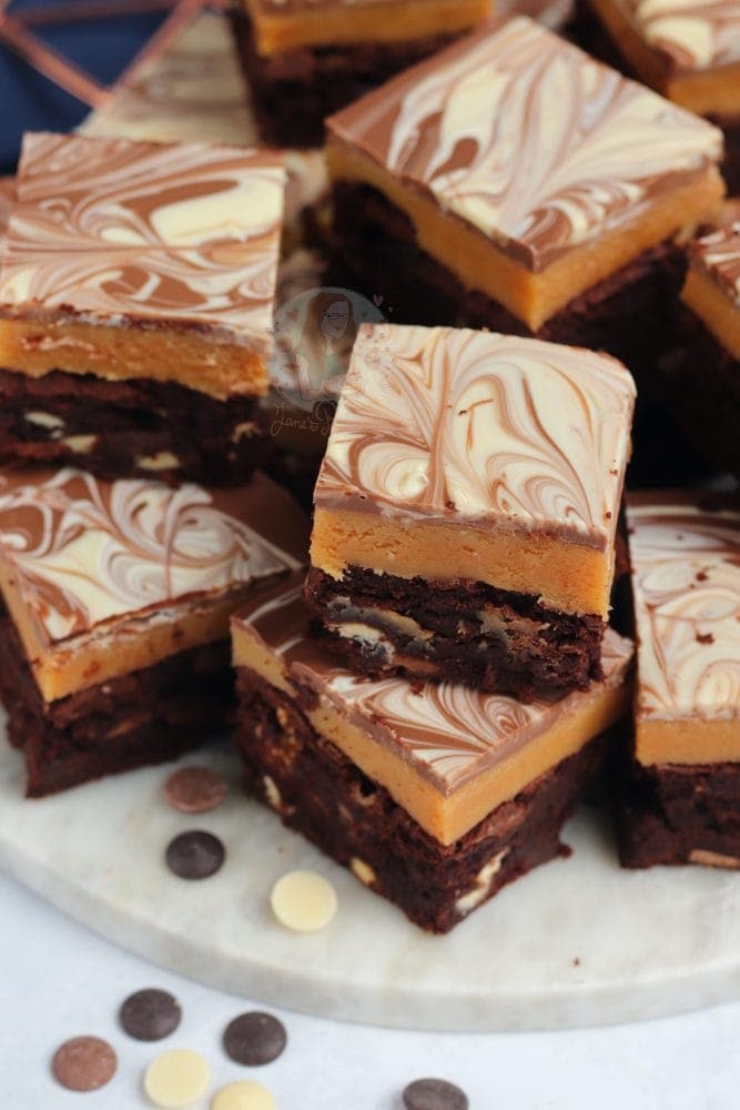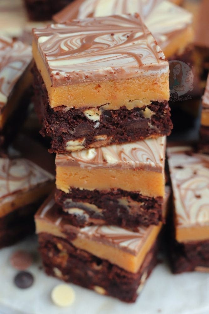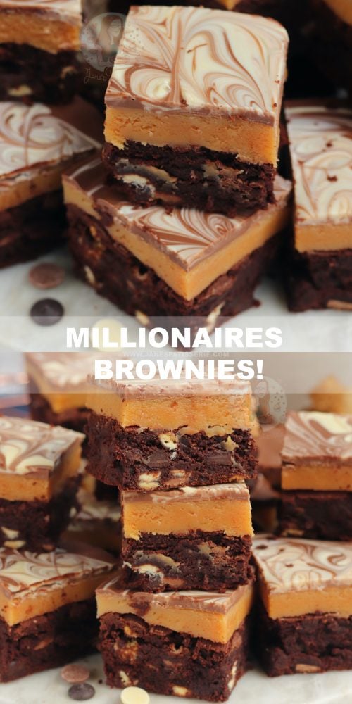 Fudgey Chocolate Chips Brownies, Easy Homemade Caramel, Swirled Milk & White Chocolate… Millionaires Brownies are heavenly!
