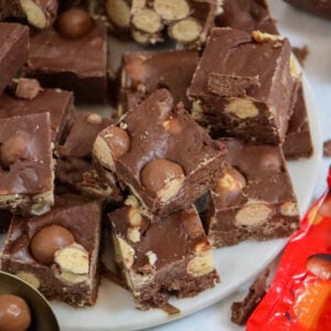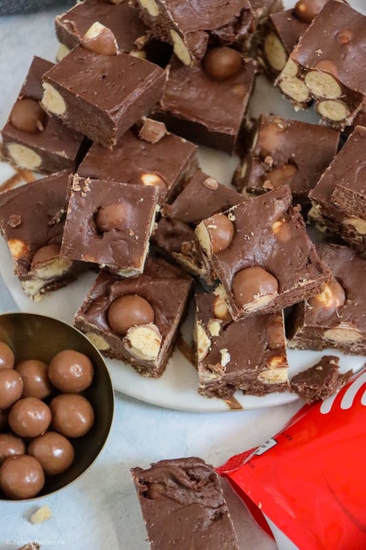 - Sprinkle on the other bag of Maltesers and press into the top of the fudge and store in the fridge for at least 3-4 hours (Or preferably overnight) to set!