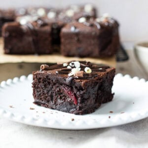 I made these ever so slightly differently this time by using caster sugar and oh my days it was delicious. I much preferred the flavour, and I feel like it made it more fudgy. Also, as I think a black forest gateau should use dark chocolate more than anything, I used dark chocolate chips in the brownie batter as well as the extra dark chocolate, but you can swap the chocolate chips that you fold through (not the ones you melt for the batter) to milk chocolate, and the drizzle on top can also be milk chocolate, for these though I prefer dark!