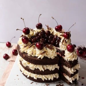 To make it perfectly Black Forest, I drizzle some of the kirsch liquid from my jar of cherries over each sponge as soon as it comes out of the oven. It soaks right in while the cake is still warm and gives it a subtle boozy cherry warmth. That little extra step makes every bite feel extra special and ties the whole flavour together beautifully.