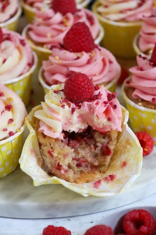 I piped the buttercream onto the cupcakes, sprinkled on some freeze dried raspberries, lemon zest and added a fresh raspberry and they were done! I do think they’re super pretty cupcakes, as well as being utterly scrumptious.
