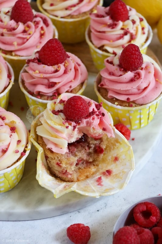 Lemon cupcakes with a raspberry jam centre, and swirled lemon and raspberry buttercream. My new favourite summery lemon and raspberry cupcakes!