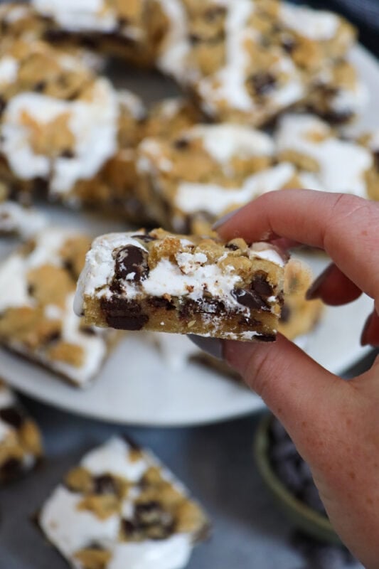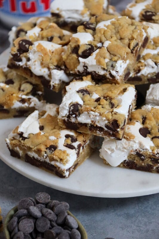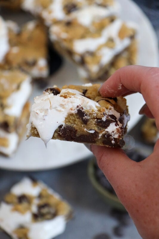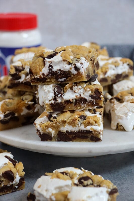 If you have a look at my s’mores cookie recipe however, you can see that I made my own version of marshmallow fluff for this, and it will work perfectly for these cookie bars as well – it’s a bit more intense to make your own, but it’s worth it if you are up for it.