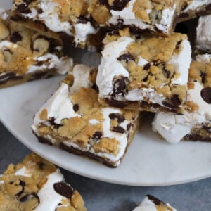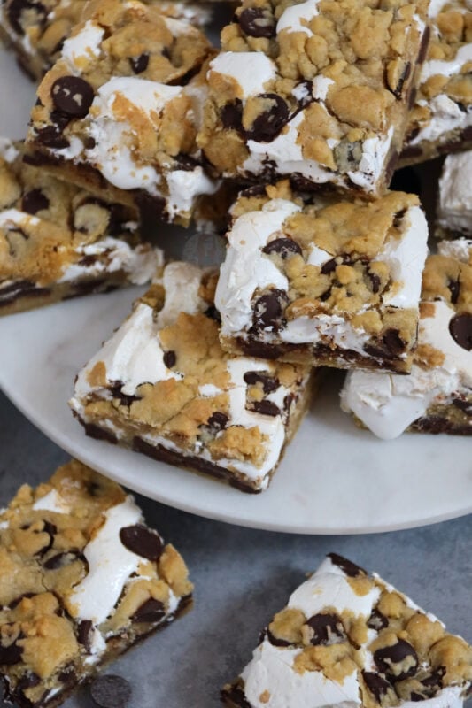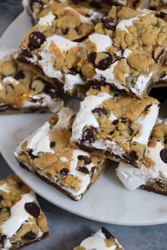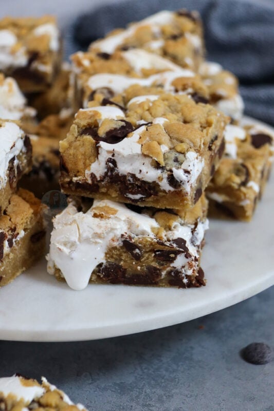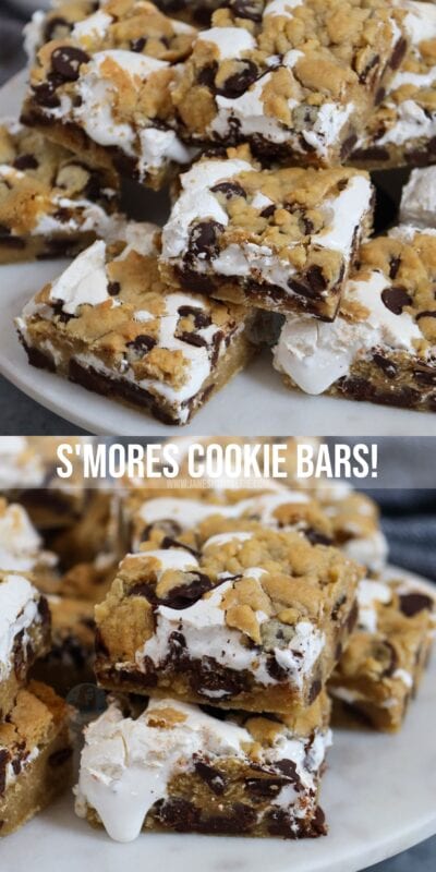 Gooey chocolate chip cookie, gooey vanilla marshmallow, make THE most delicious s’mores cookie bars ever!