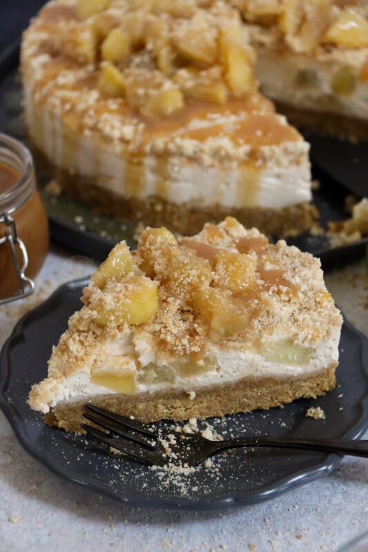 Buttery biscuit base, vanilla cinnamon apple crumble cheesecake filling, and even more crumble apple goodness on top.