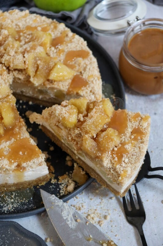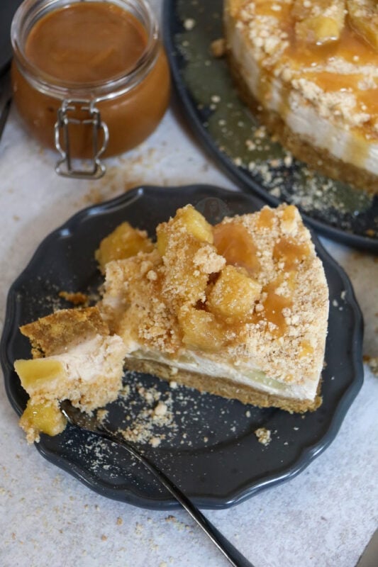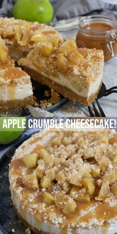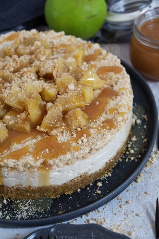 A crumble is so easy to make with sugar, butter and flour, rubbed together. You can use a ready made crumble mix and still bake and that’s totally okay. You can add another level to your cheesecake by drizzling over a caramel sauce aswell; caramel and apple go together just as well as cinnamon and apple do in my mind.