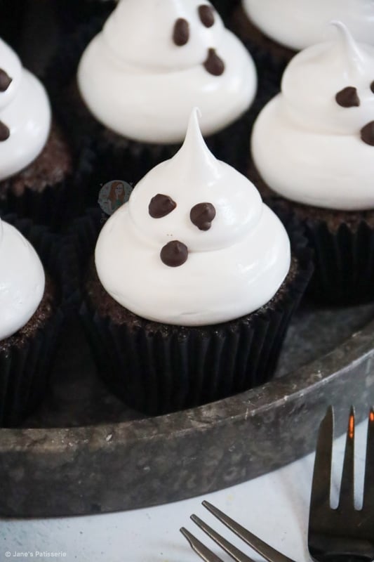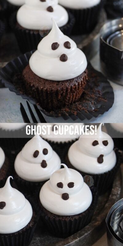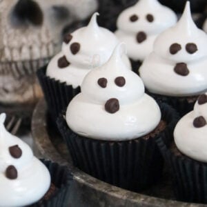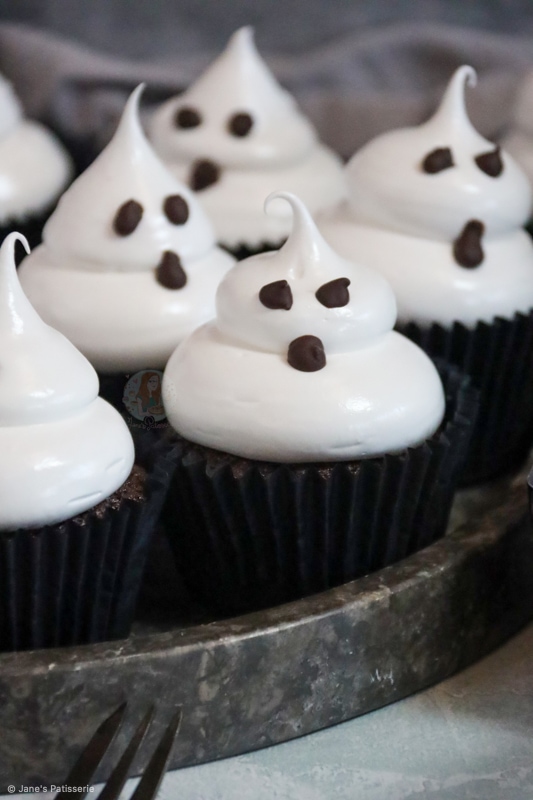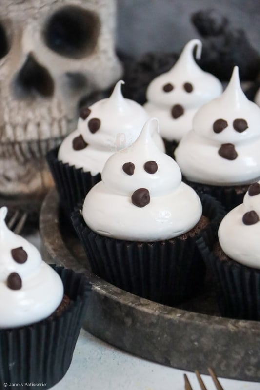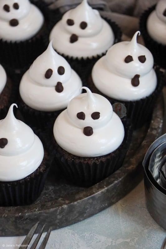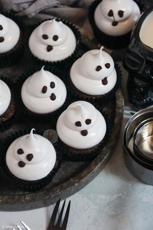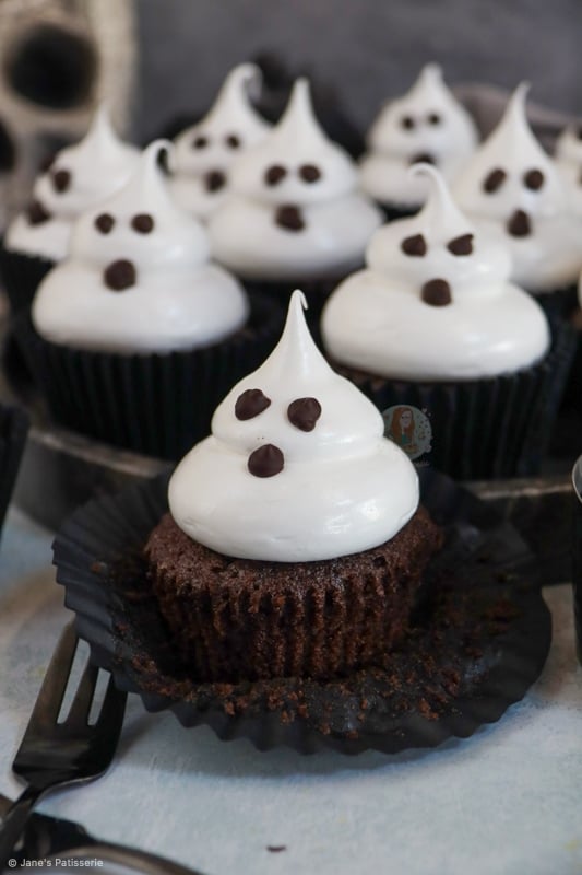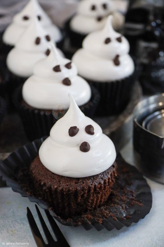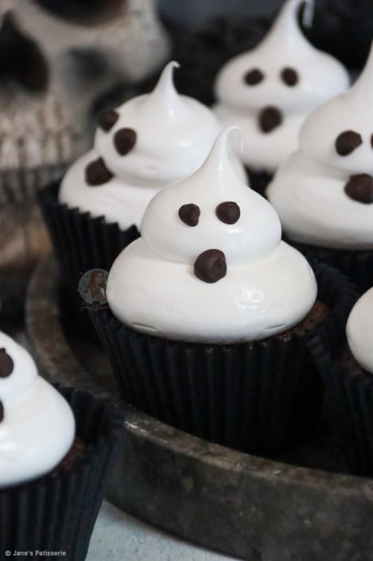 Chocolatey and delicious chocolate cupcakes topped with an italian meringue to make cute and spooky ghost cupcakes for Halloween!
