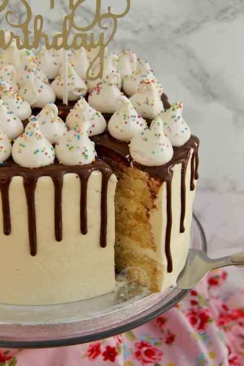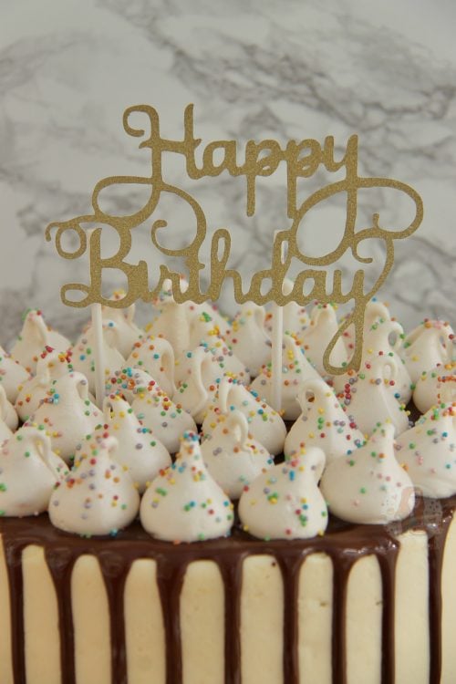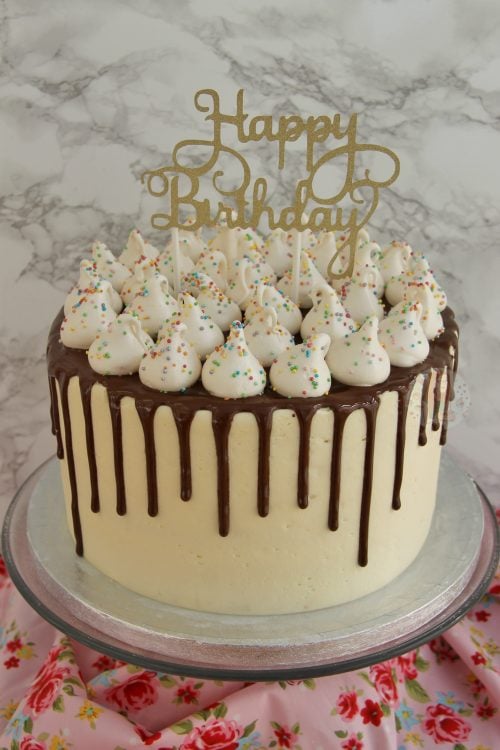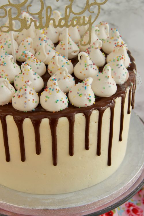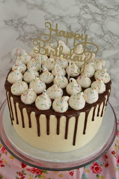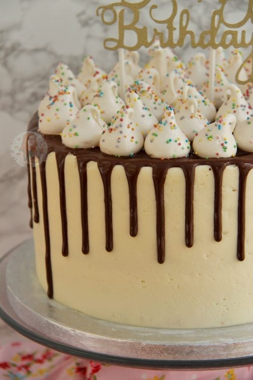 - I followed a similar method to my Caramac cake recipe, but used a vanilla buttercream, chocolate drip, and then the mini meringues on top. It’s quite simple, but I think its nice!