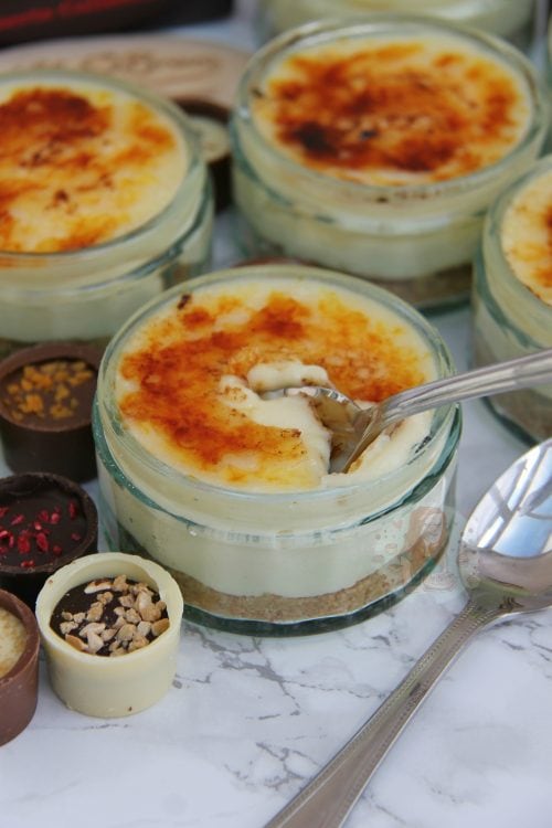 - Fold through the white chocolate. Split the mixture between the 12 cheesecakes. Try and make the mixture as flat as possible on top for the creme brûlée part.