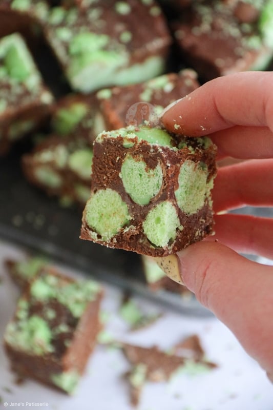 - Fold through 3/4 of the Mint Aero you are using, or more if you fancy, and then pour into the tin and smooth over the mixture.