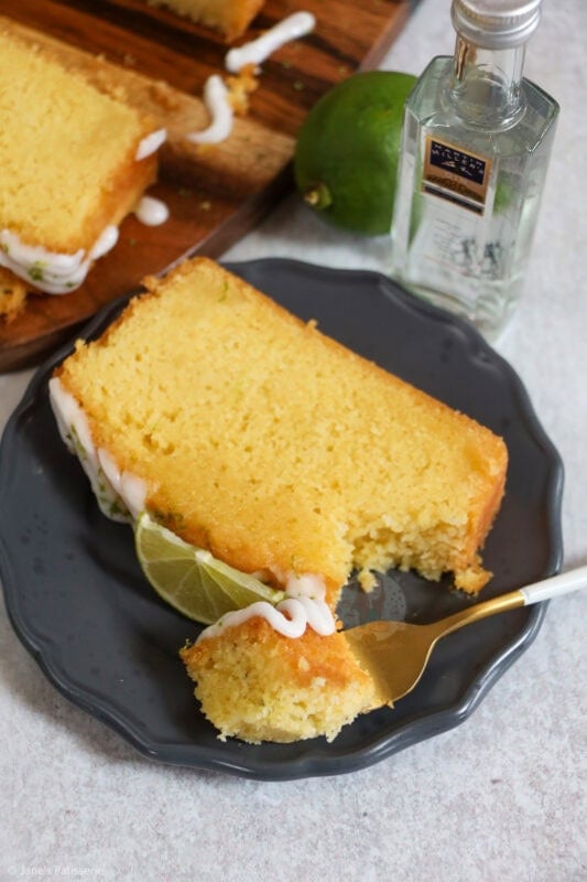 A delicious gin & tonic drizzle cake with a lime sponge, gin & tonic drizzle, gin icing, and lime!