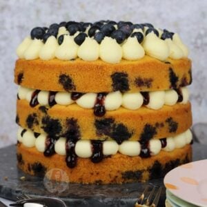 A three-layer fresh lemon & blueberry cake with lemon sponges, fresh blueberries, lemon buttercream, and blueberry jam!