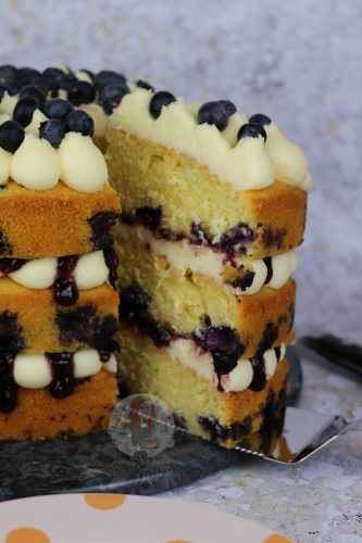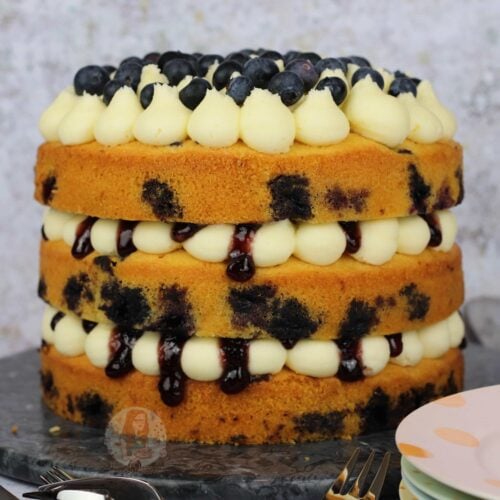 I didn’t think blueberries would be any good at this time of year yet, but oh my they have been seriously delicious. So, this cake happened. I was wondering how I could make something fruity, and light, but so moreish and a bit of a showstopper… so I wanted something that would dazzle. The fresh blueberries in the sponges give the cake a whole new element.