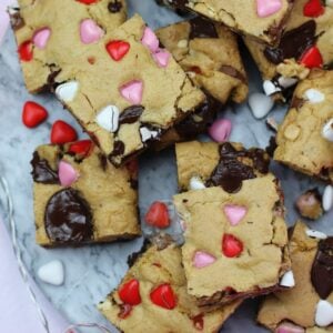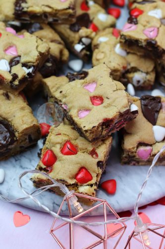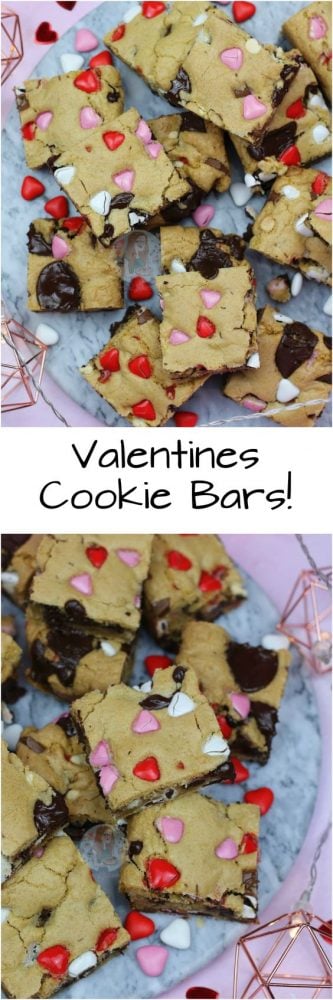 Chocolatey, gooey, delicious cookie bars with pink, red and white chocolates for Valentines! Heavenly Valentines cookie bars!