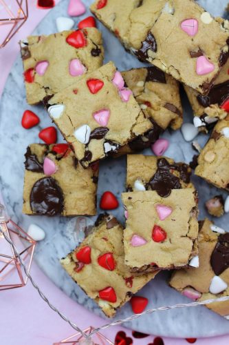 Made these today ready for Valentine’s Day tomorrow and I’m super happy with the results! II didn’t add 250g of pink/red chocolate as I couldn’t find any so had to buy some bags of M&M’s and just pick the red ones out, this is just because I’m trying to use things up that I already have. So I made the cookie dough with the chunks in and then just pressed the red M&M’s into the top of it once it was in the baking tray. It has still turned out just as good as I expected and I’m sure my boyfriend will enjoy them.