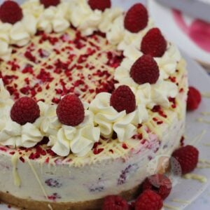 A no-bake white chocolate and fresh raspberry cheesecake with a buttery biscuit base, white chocolate & raspberry cheesecake filling!