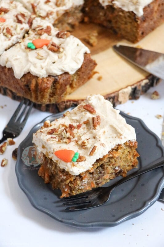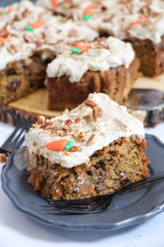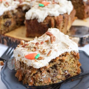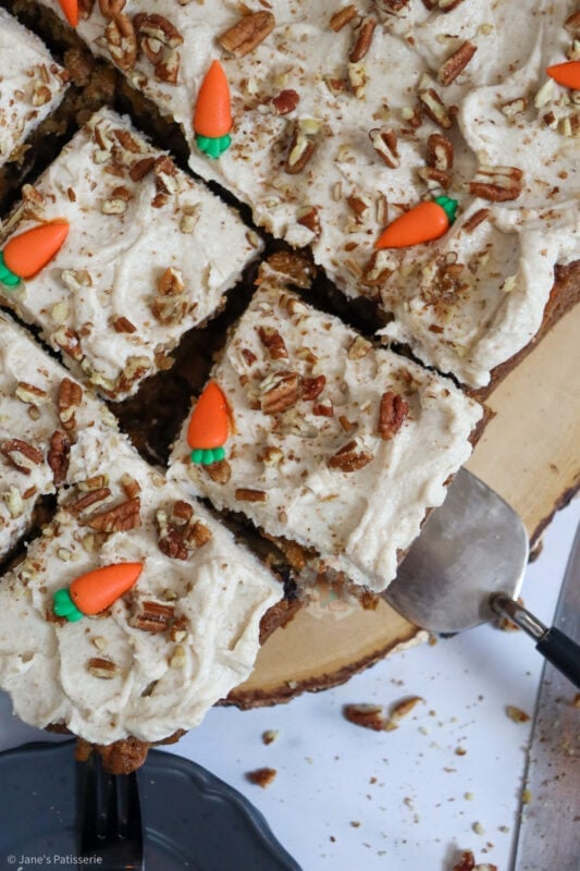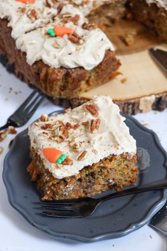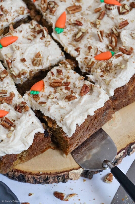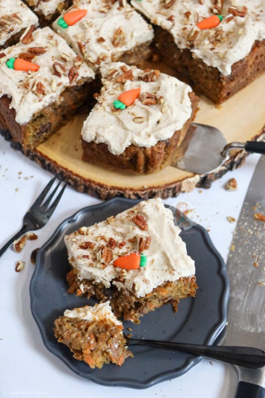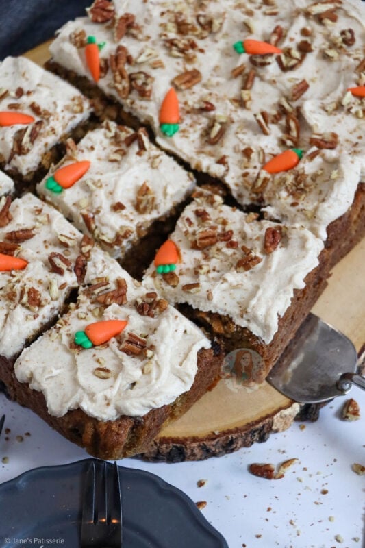 A delicious, easy, and moreish carrot cake traybake with cream cheese frosting and chopped nuts!