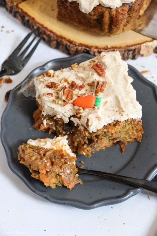 You can see in the pictures how delicious it looks, but it is definitely versatile. Add more nuts, no nuts, add more raisins, or no raisins… its entirely up to you. If you wanted to use a buttercream topping so it doesn’t have to be kept in the fridge, then you can easily use the one from the original carrot cake recipe. It’s the best thing to do if you want it to be out at a party for example or you have to travel with it!