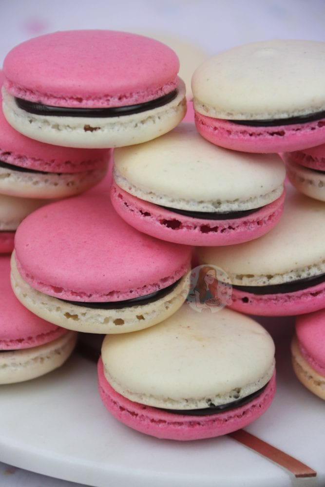 - Pipe a smallish amount into the middle of all of the strawberry or vanilla macarons, and then sandwich on the opposite colour/flavour.