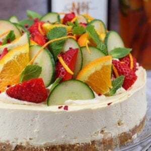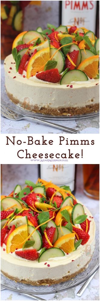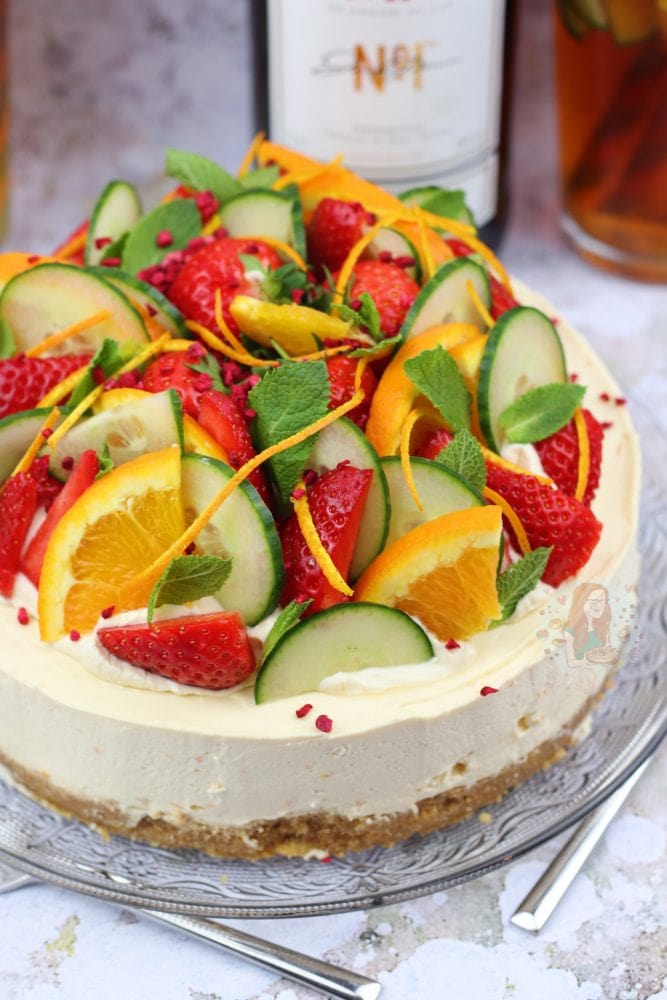 A delicious no-bake Pimm’s cheesecake thats perfect for summer – the cheesecake version of the popular drink!