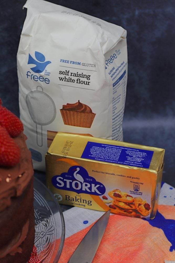 The other part of this cake, other than the chocolate which we have covered, is the butter. Butter is something that is important to a cake, other than in a recipe such as a gluten free carrot cake for example. The best thing product I have found to replicate butter, is the Stork for baking & cooking. It’s the one wrapped in foil. Not the various tubs, the foil one.
