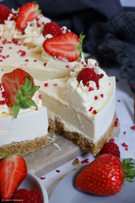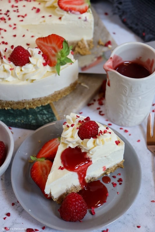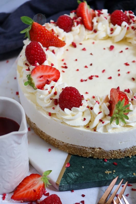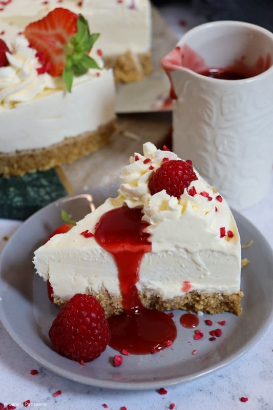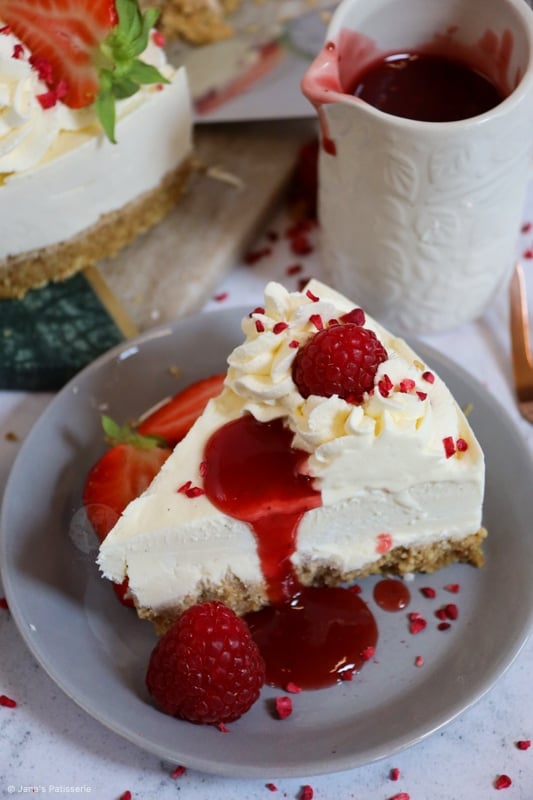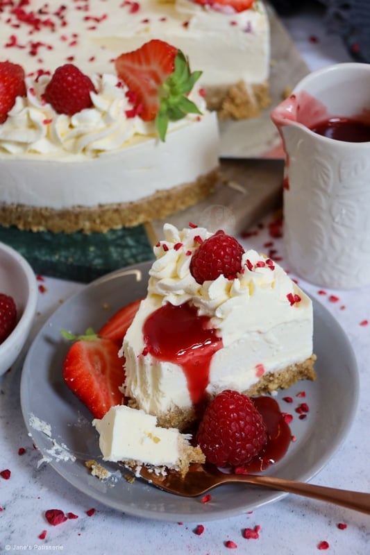 The wonderful thing about using a ‘plain’ cheesecake base such as this, is that you can easily decorate it with whatever flavours you want. For example, when I took the photos I had some spare raspberry coulis on my hands, and some fresh fruit. However, I know that some people aren’t really into the fruity side of things so you could use melted chocolate, or an ice cream sauce, or even some homemade caramel sauce!
