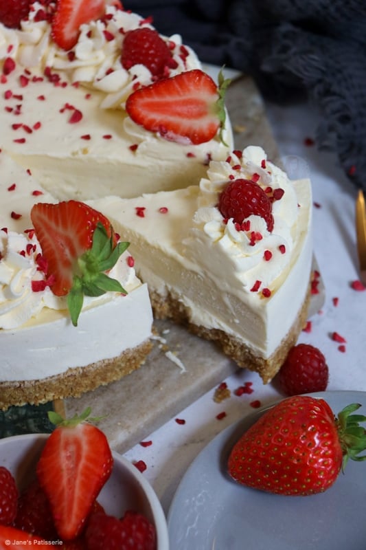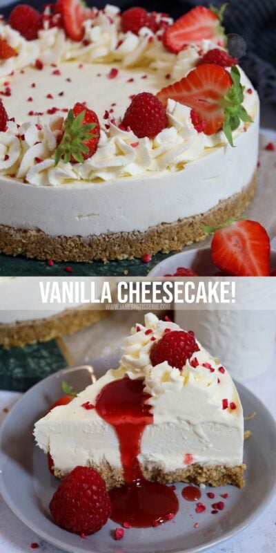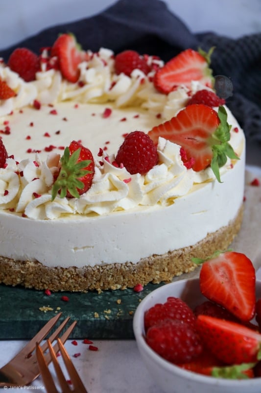 A back to basics recipe of a buttery biscuit base, creamy no-bake vanilla cheesecake filling, and whipped cream on top
