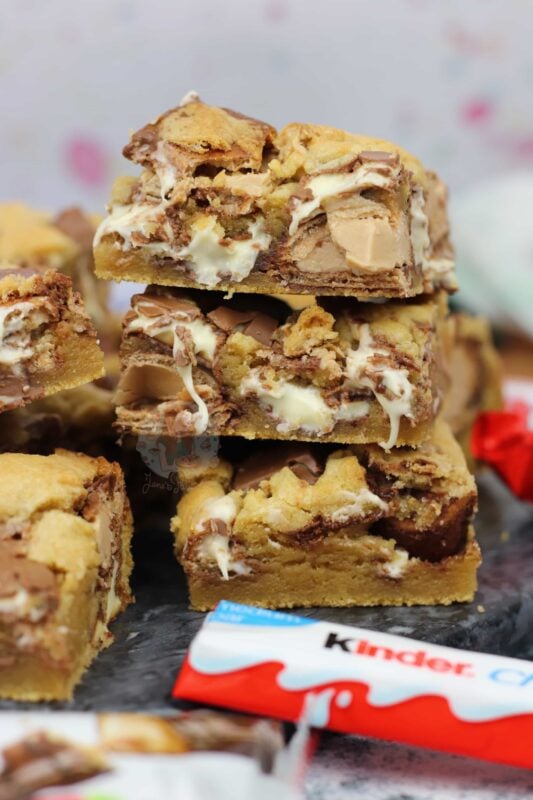 Gooey, delicious Kinder Bueno cookie bars packed full with Kinder chocolate and Kinder Bueno pieces