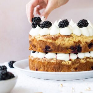 This cake does take a smidge longer to bake compared to the apple crumble cake, because the blackberries have more juice in them. Don’t be worried, stick to the idea that the cake will take roughly 50-55 minutes, but you’ll know its finished baking when it stops making a faint bubbling sound, and the skewer should be clean as well. You can serve this as is, or with ice cream, cream or anything you desire.