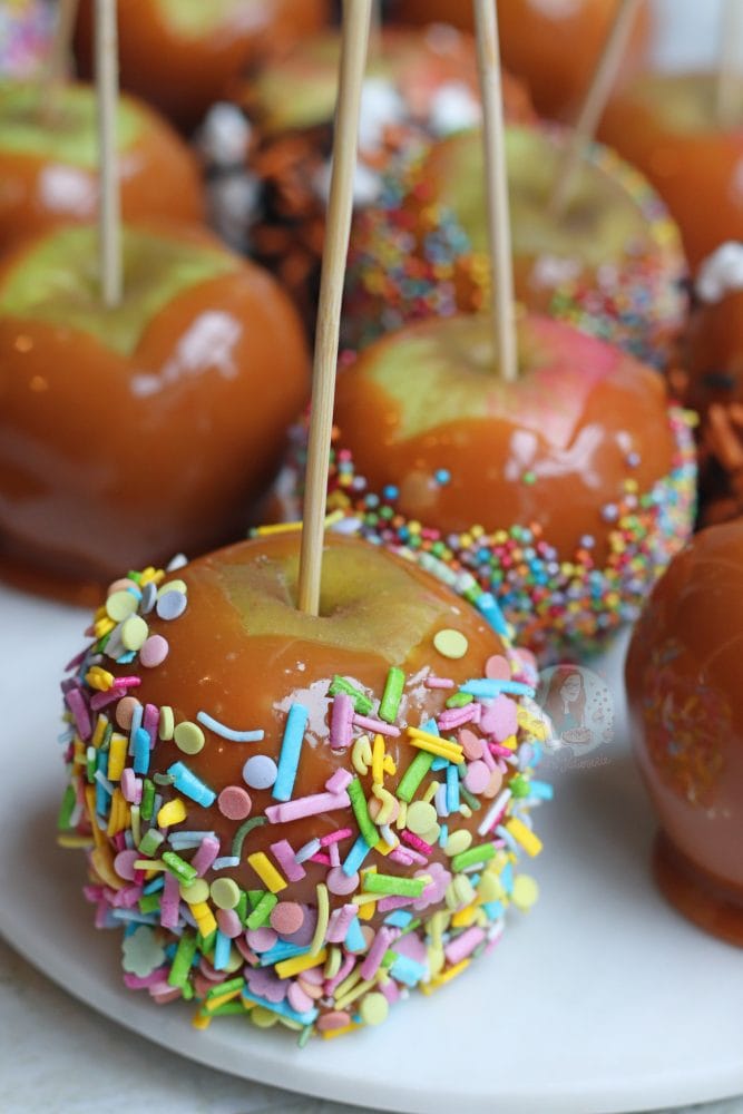 - If coating in sprinkles, roll the apple carefully in sprinkles now