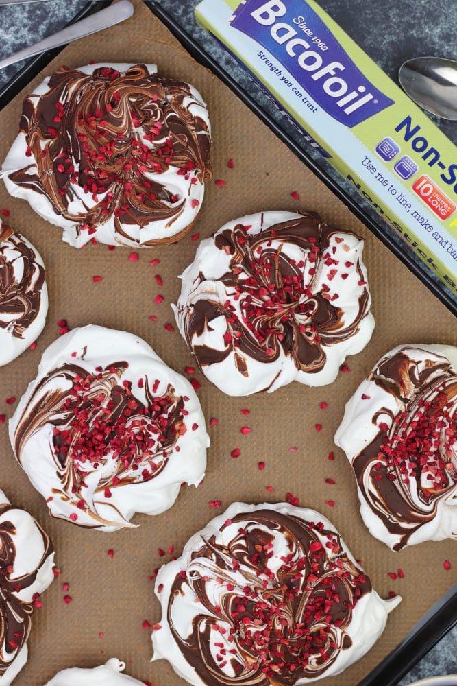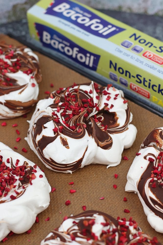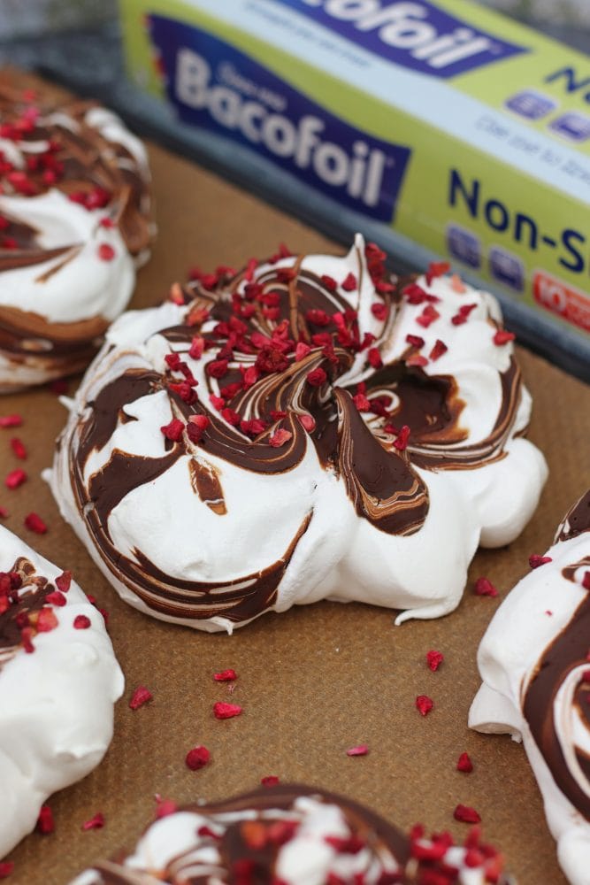 You can see from the images the little dimples on the surface of the paper, and how easy it is to use. After a really easy bake and very little washing up, you can enjoy your dessert. The delightful thing about using this recipe is even though yes it does have chocolate in, you only use 1tsp per chocolate swirl meringue, so it was enough to satisfy my cravings, but not enough for my dad to be put off.