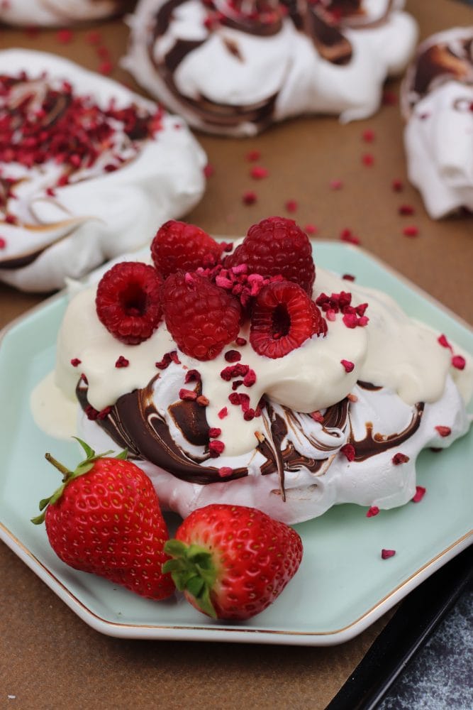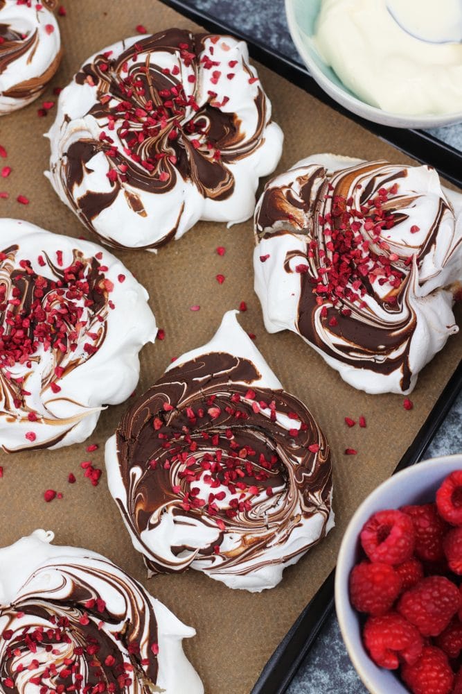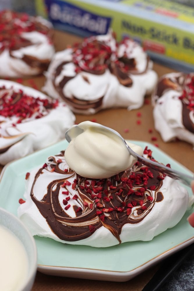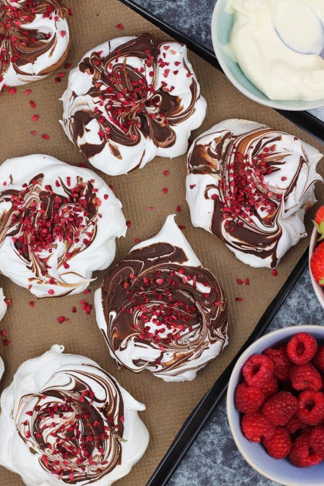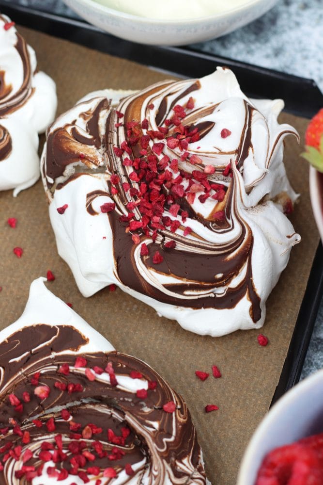 As I have said in this blog post, meringue is such a great dessert! You can change up the filling, the flavours, the decorations – sooo many possibilities! If chocolate meringue isn’t for you though, its definitely worth checking out my spring pavlova or my festive pavlova wreath…. or many other tasty meringue recipes on my website!