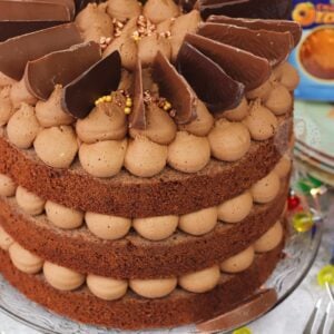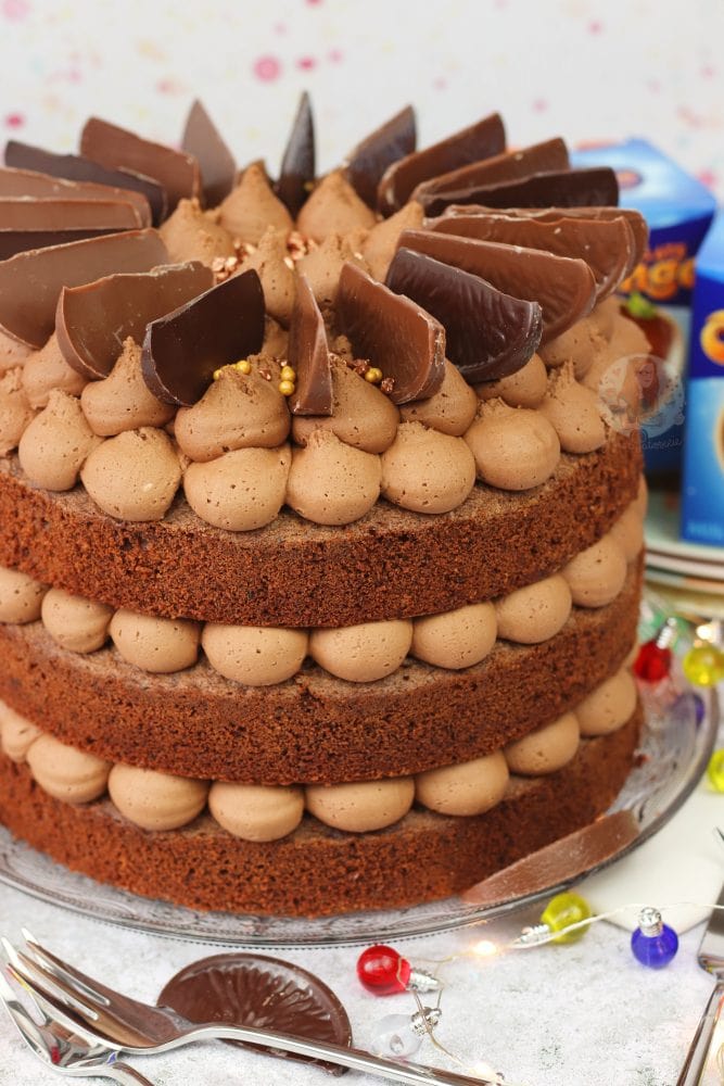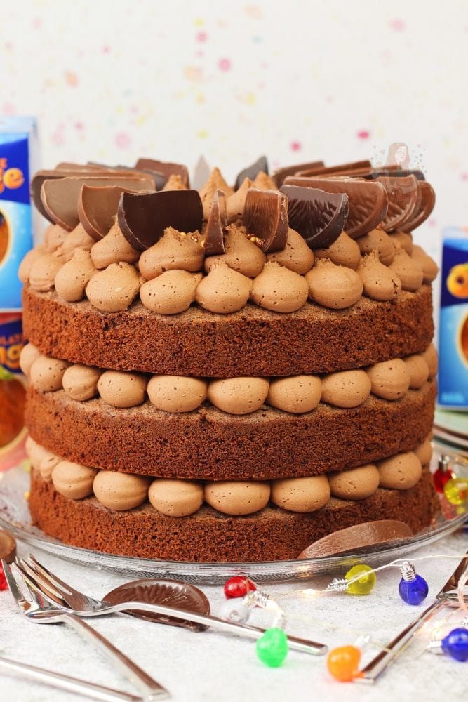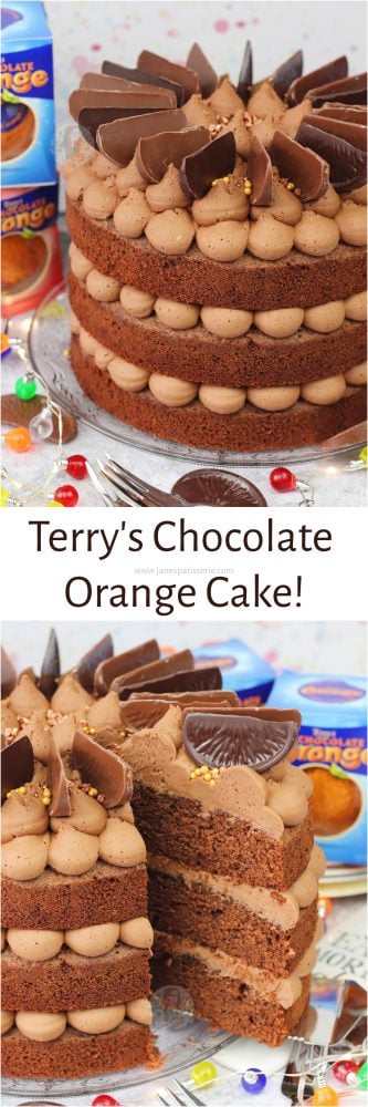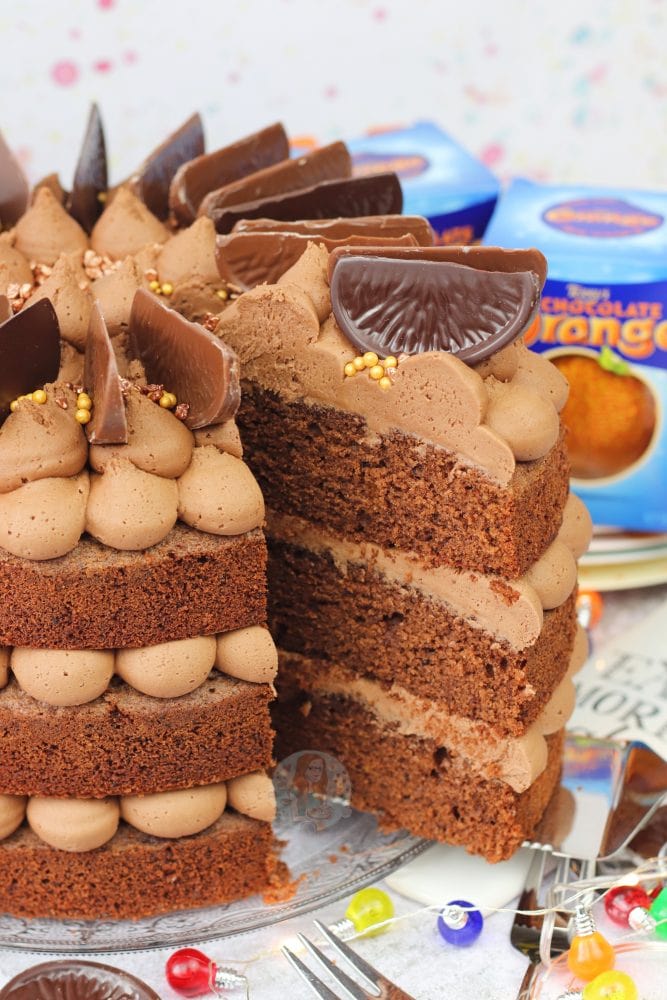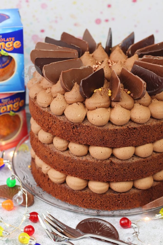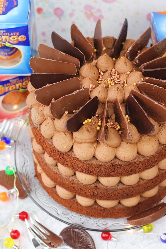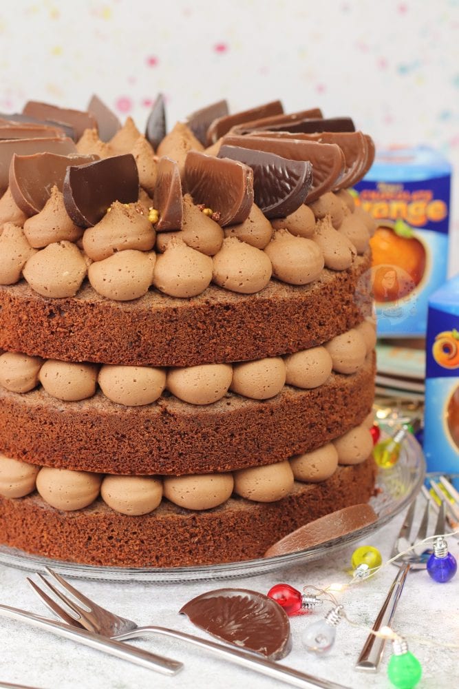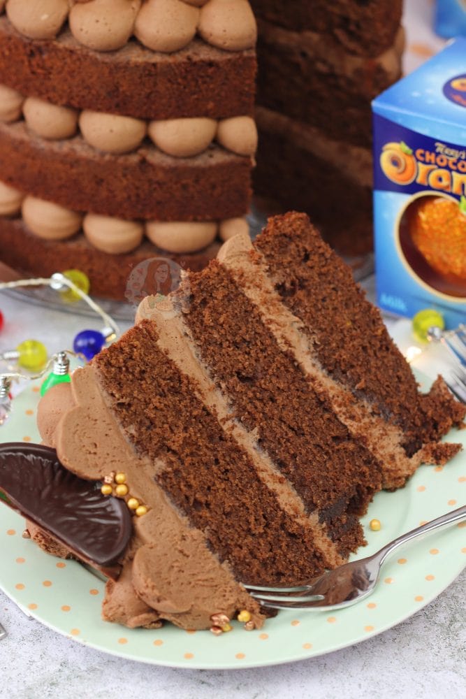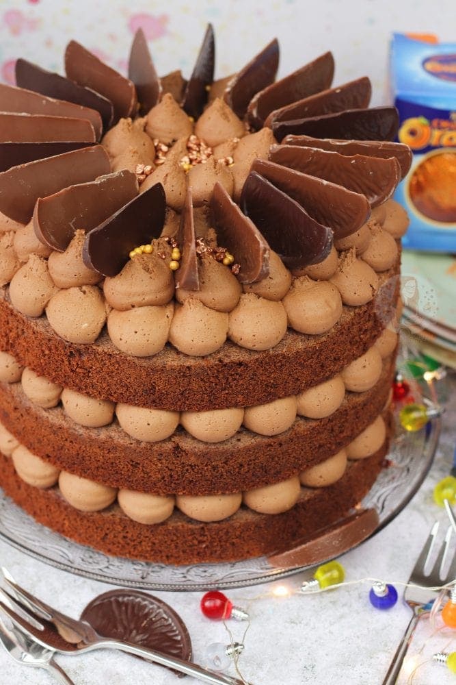 A three-layer chocolate orange cake with Terry’s chocolate orange buttercream frosting!