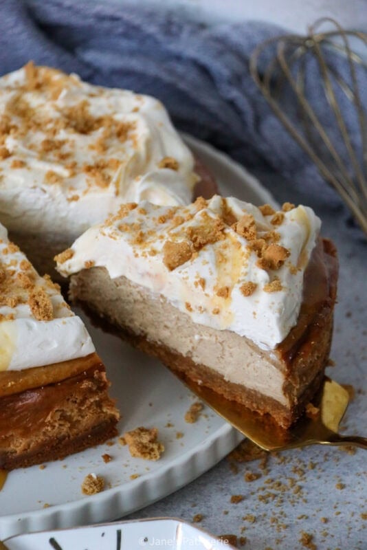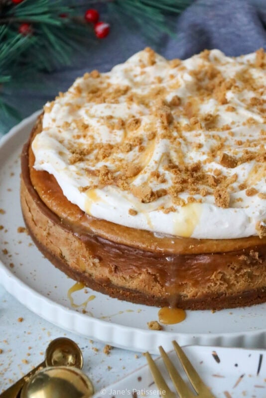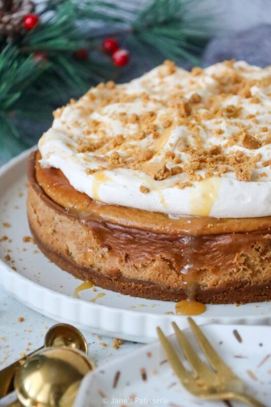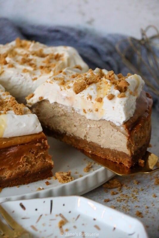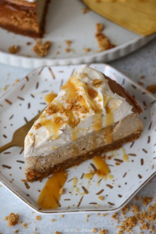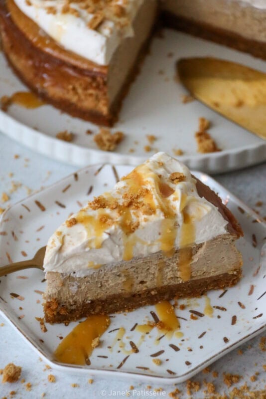 Even though I usually go all out with decorations on a cheesecake, the main part of this beauty is the flavour and texture. I wanted to add something fancy, so simple whipped together a sweetened whipped cream (double cream whipped lightly with some icing sugar for sweetness and stability) and dolloped this on top off the cheesecake. I didn’t do any fancy piping on this occasion, as I wanted to swirl some caramel into it for balance of flavour.