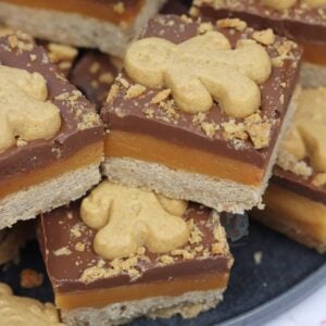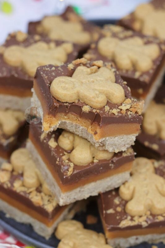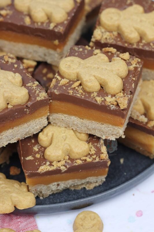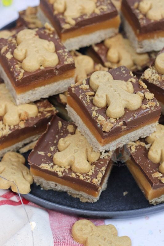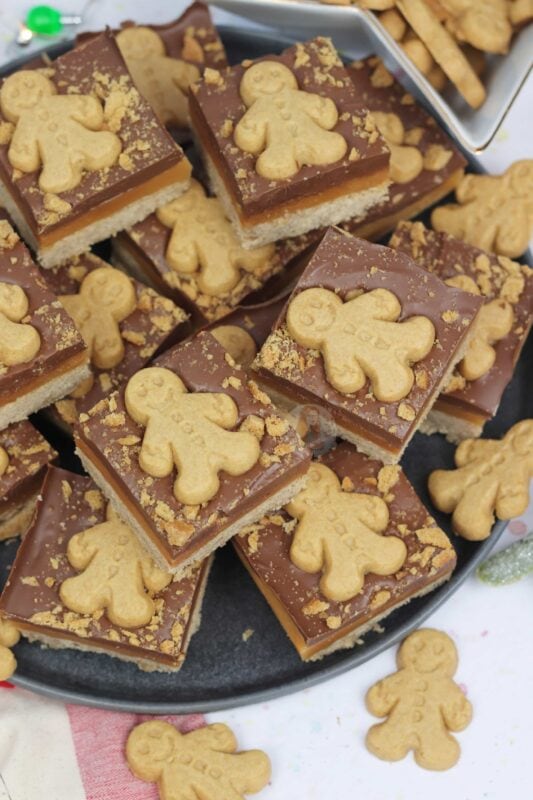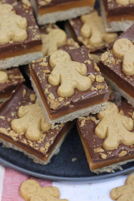 A homemade gingerbread shortbread, topped with homemade caramel, ginger chocolate and gingerbread men! Perfect gingerbread millionaires shortbread!