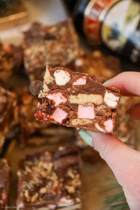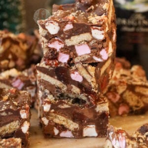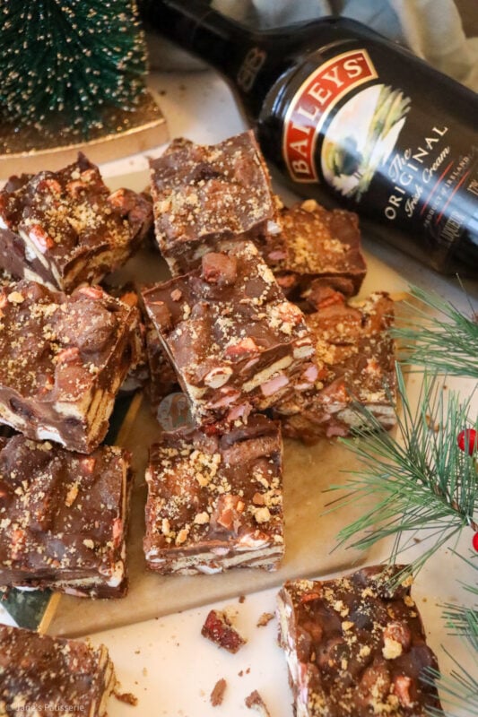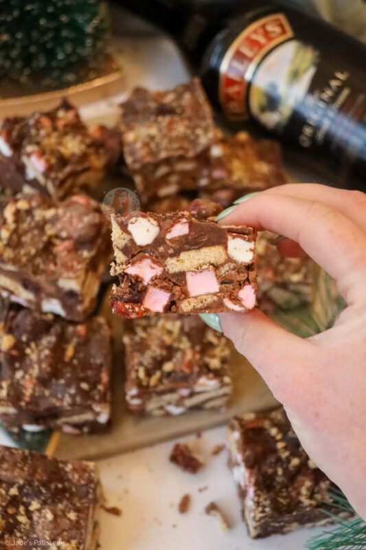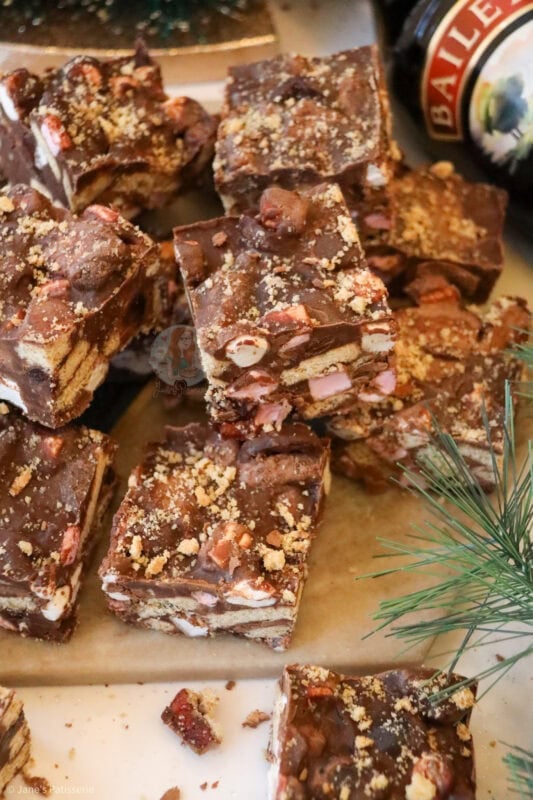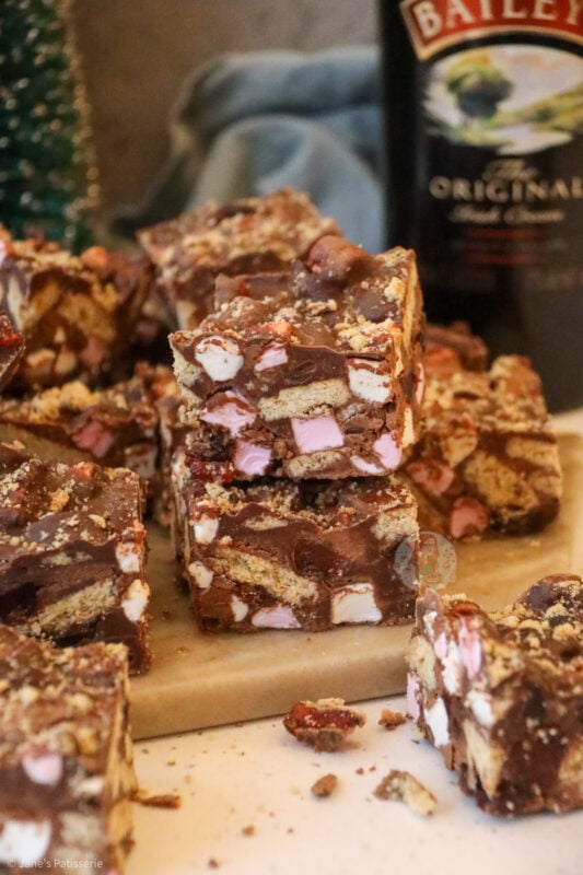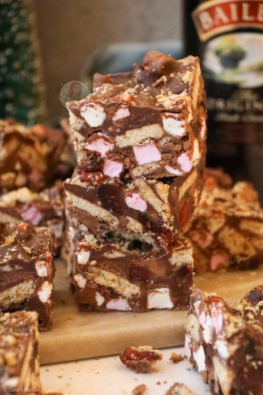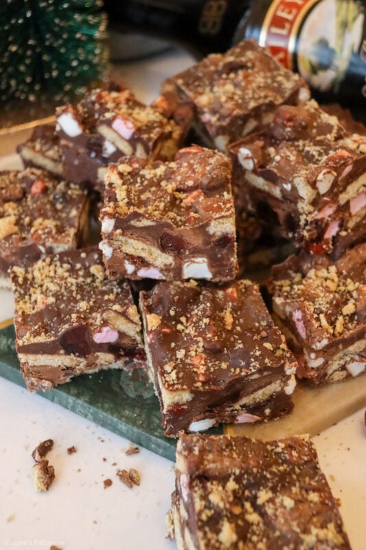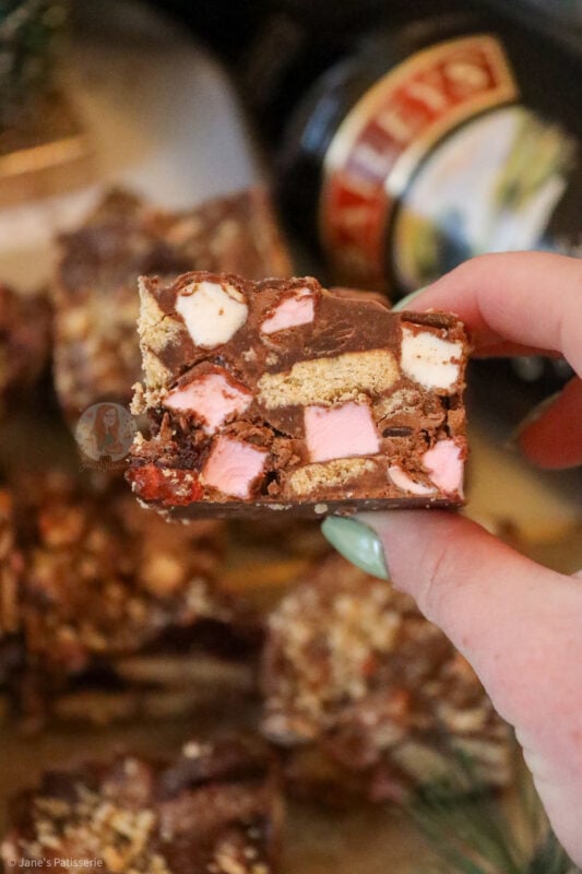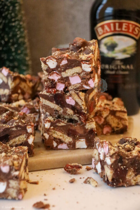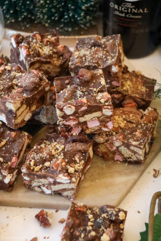 Delicious and festive no-bake Baileys rocky road with oodles of chocolate, biscuits, marshmallows and glacé cherries!