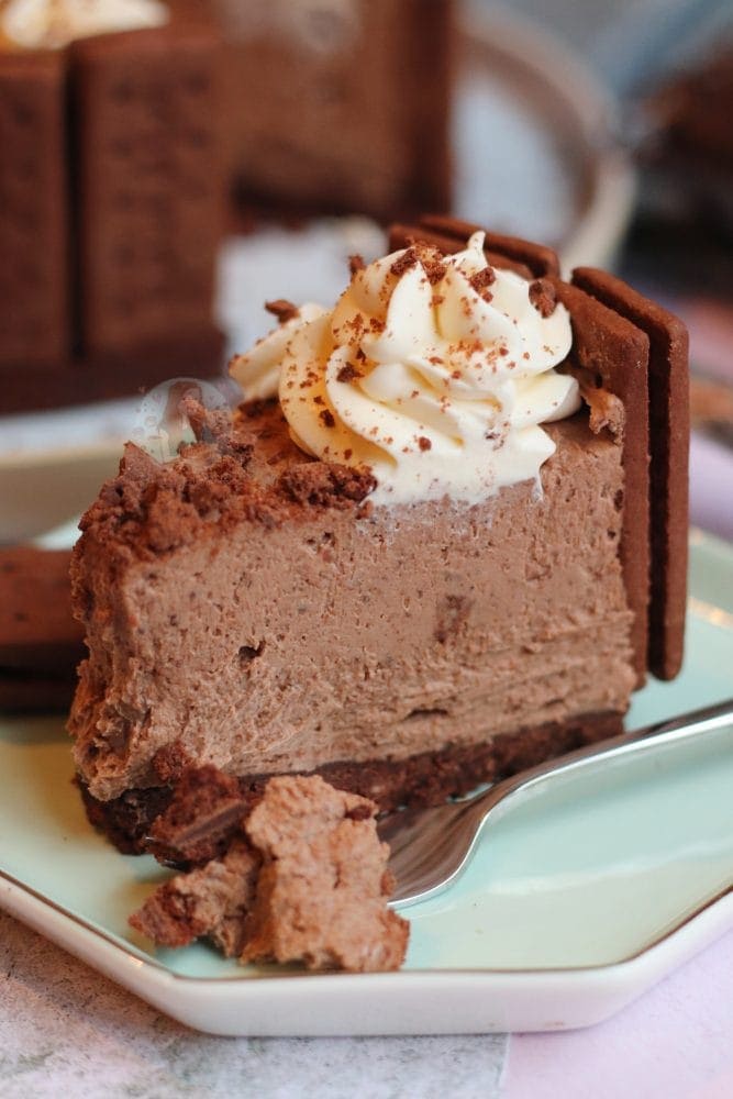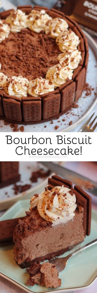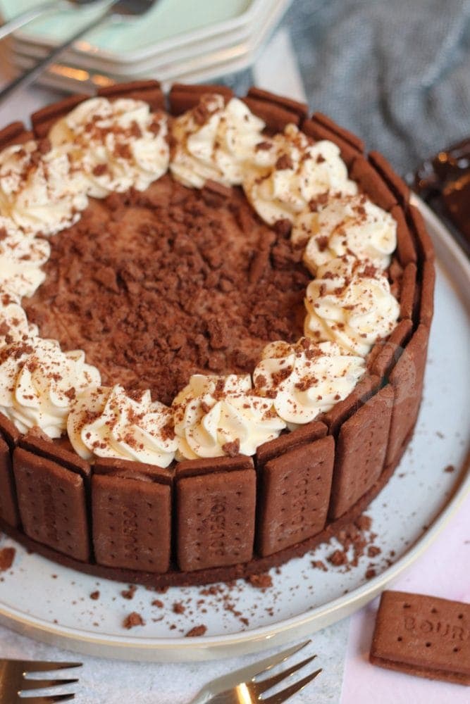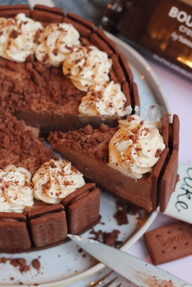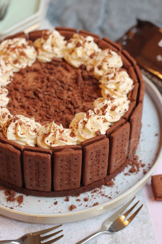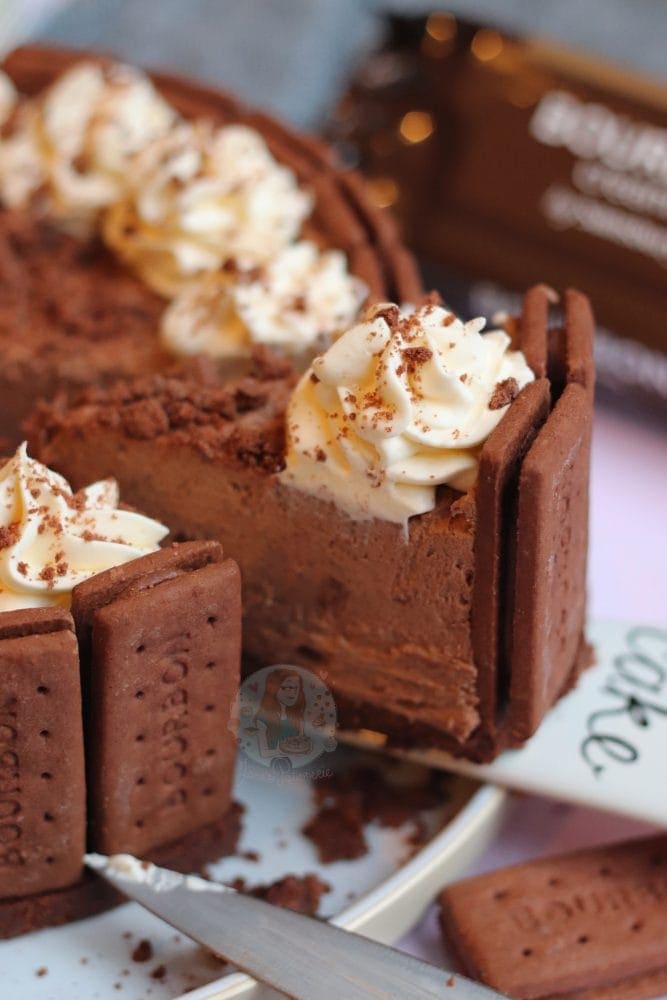 Easy no-bake chocolate bourbon biscuit cheesecake with a bourbon biscuit cheesecake shell!