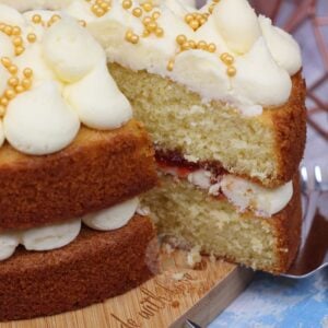A delicious two layer vanilla cake with vanilla buttercream and strawberry jam!