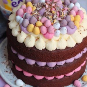 A three-layer Mini Egg chocolate cake with pastel vanilla buttercream frosting and Mini Eggs! Perfect Easter showstopper!
