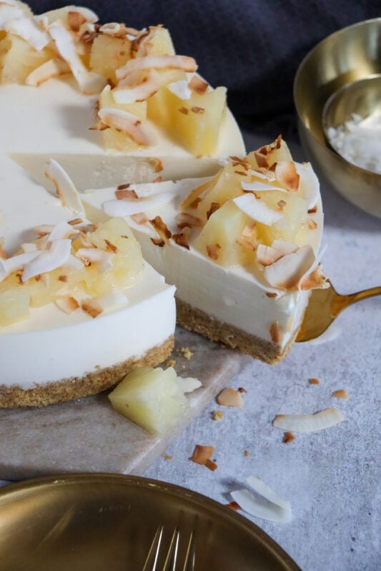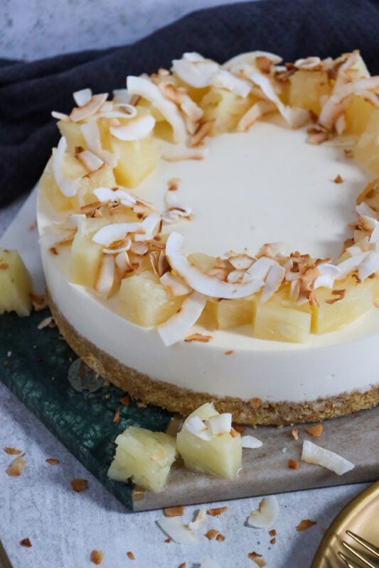 A coconut, pineapple and rum based piña colada cheesecake with a coconut and biscuit base, and pineapple and coconut on top!