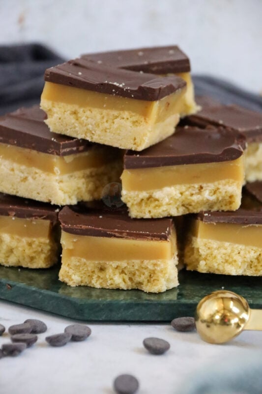 I made this twice. The first time, I used gluten free flour for the base and that worked well. I boiled the caramel for longer than stated as it didn’t seem to thicken like it says in the recipe, and it read 108C on my thermometer. That set well in the fridge was but a bit too gooey at room temperature and the chocolate cracked when I cut it. The result was that the caramel oozed out of the sides and the chocolate cracked into large chunks when it was eaten. Messy and not ideal.