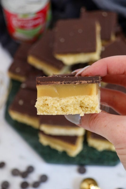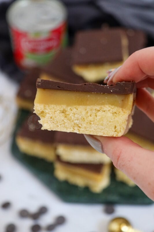 I tried using my other caramel from most of my other millionaires recipes such as my Mini Egg millionaires, but I just didn’t like it as much. It didn’t set as well for me, and the colour was too light. Doing it this way, with the light brown sugar means you get a much better caramel with the amazing vegan condensed milk.