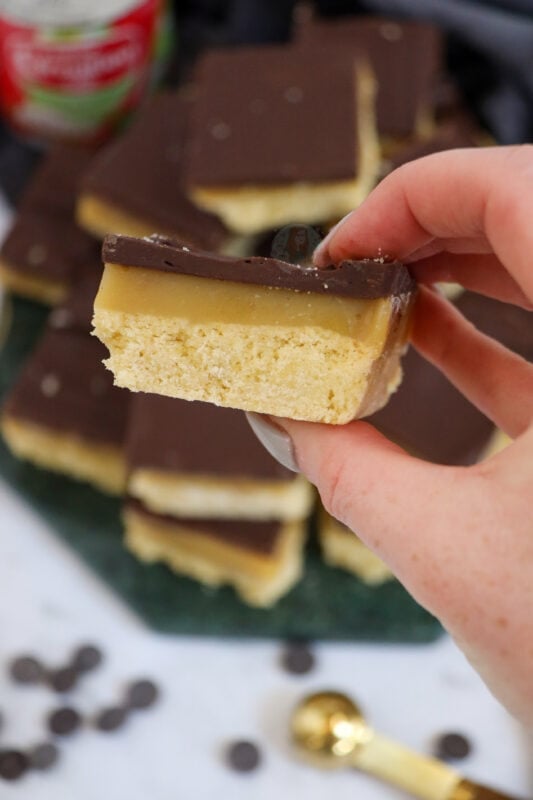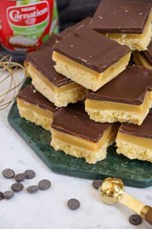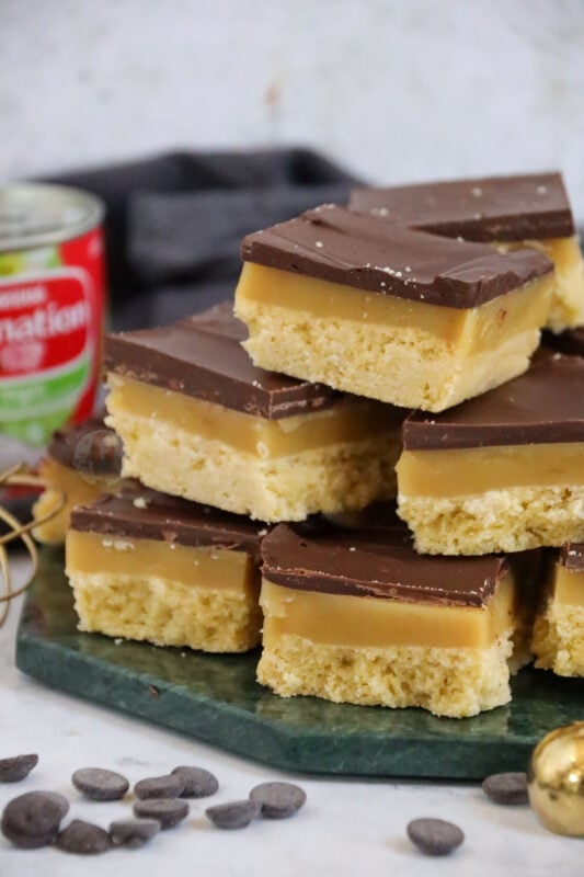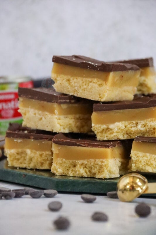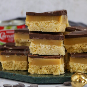 I have seen many vegan millionaires shortbread recipes now that use medjool dates, cashew nuts, maple syrup etc… and whilst I have literally no issue with this whatsoever, they’re just not ingredients that I commonly buy for my baking.