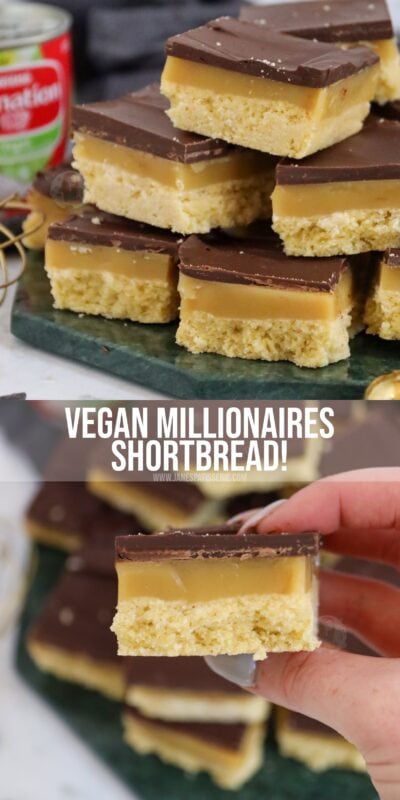Vegan millionaires shortbread with vegan shortbread base, vegan caramel filling and vegan chocolate on top!