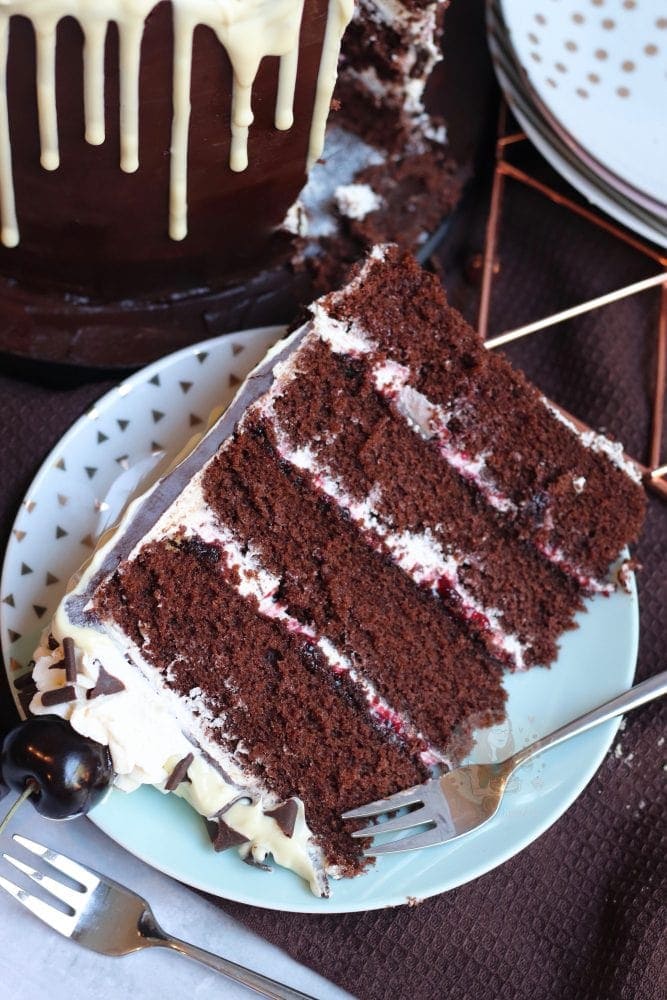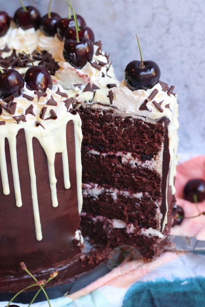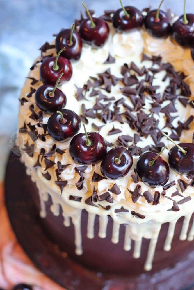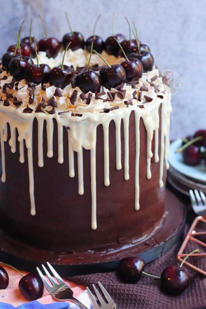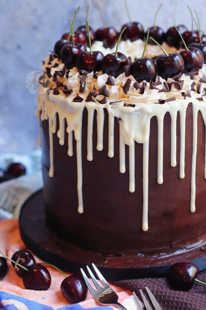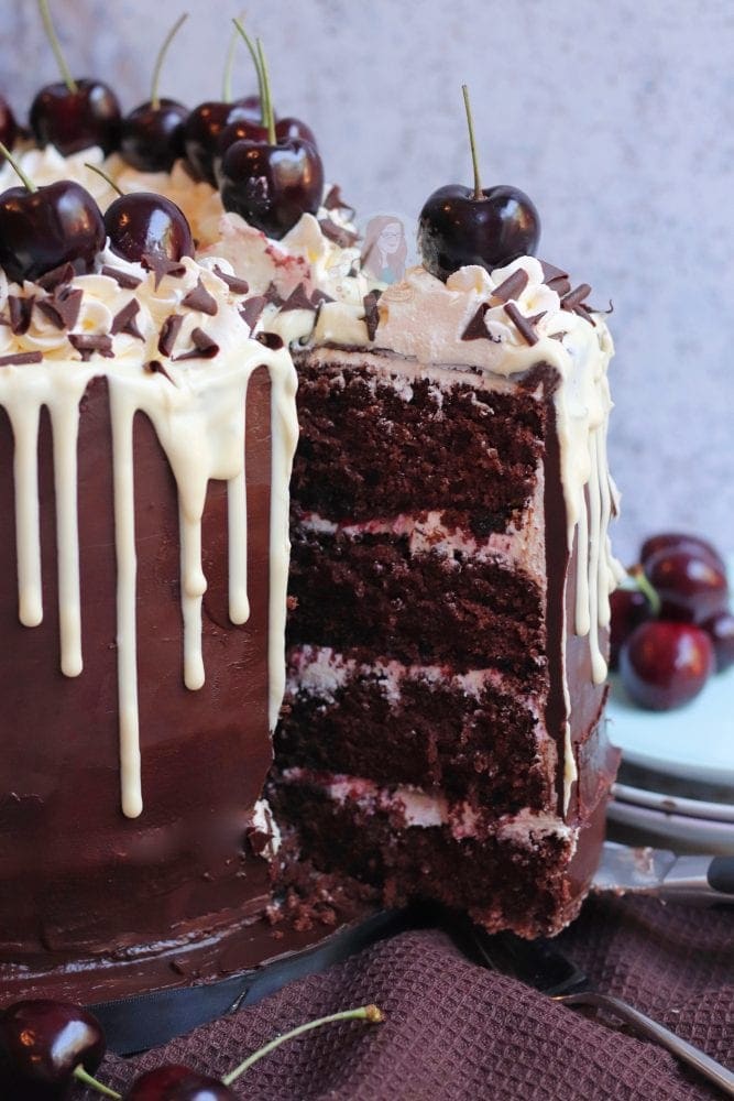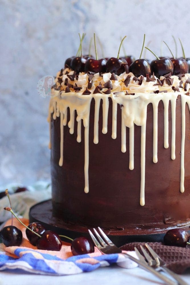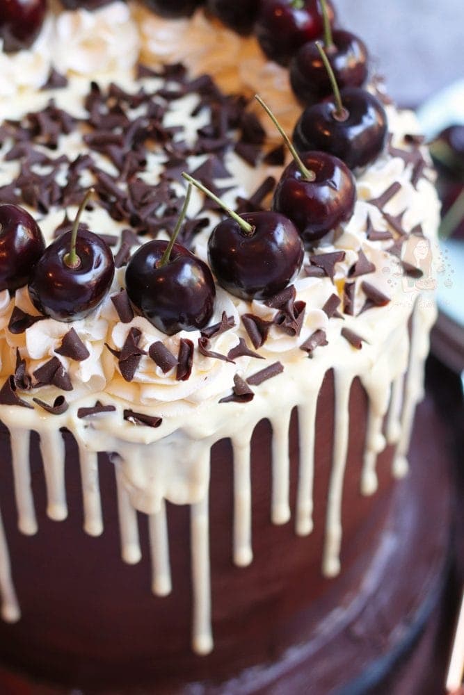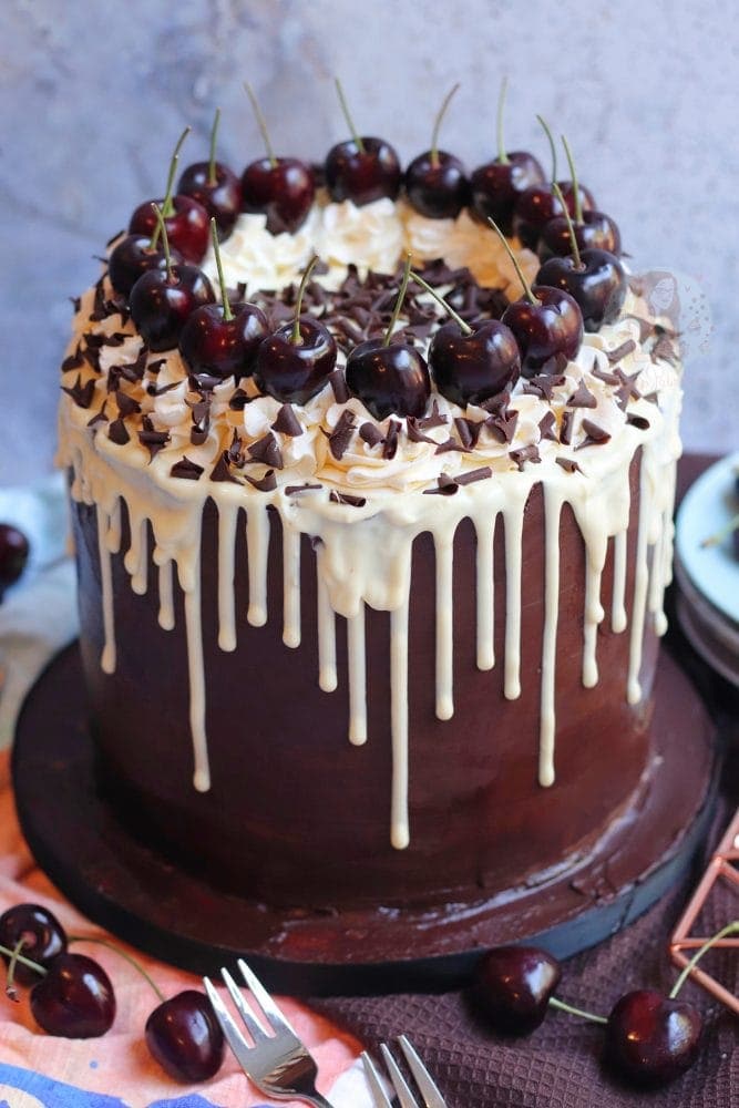 A four-layer black forest drip cake with chocolate sponges, cherries, vanilla buttercream, chocolate ganache, a chocolate drip and even more!