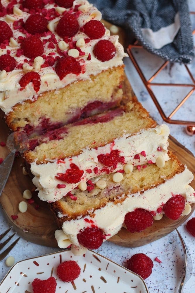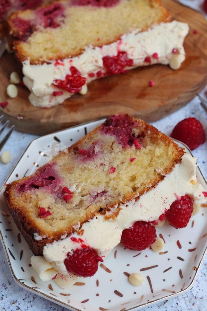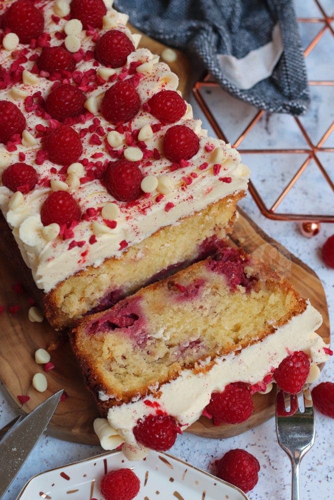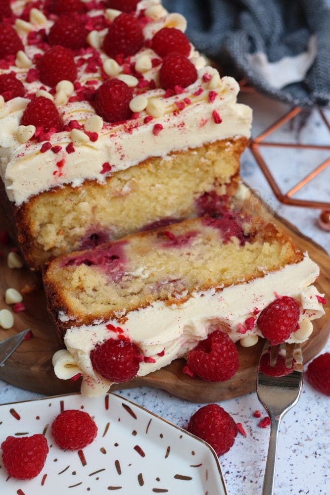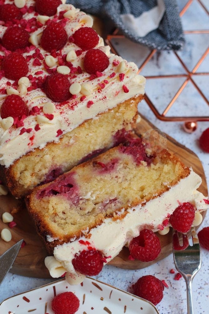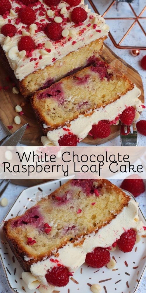 A simple and delicious white chocolate raspberry loaf cake with white chocolate buttercream frosting and fresh raspberries!