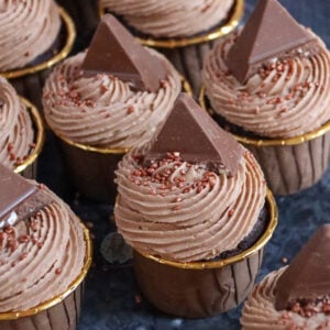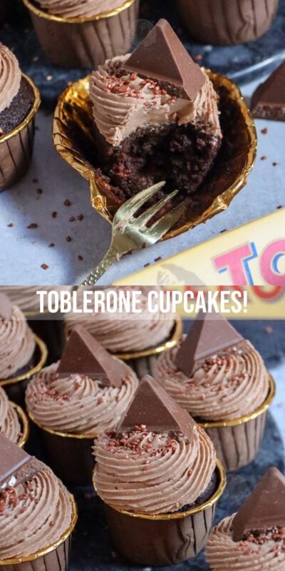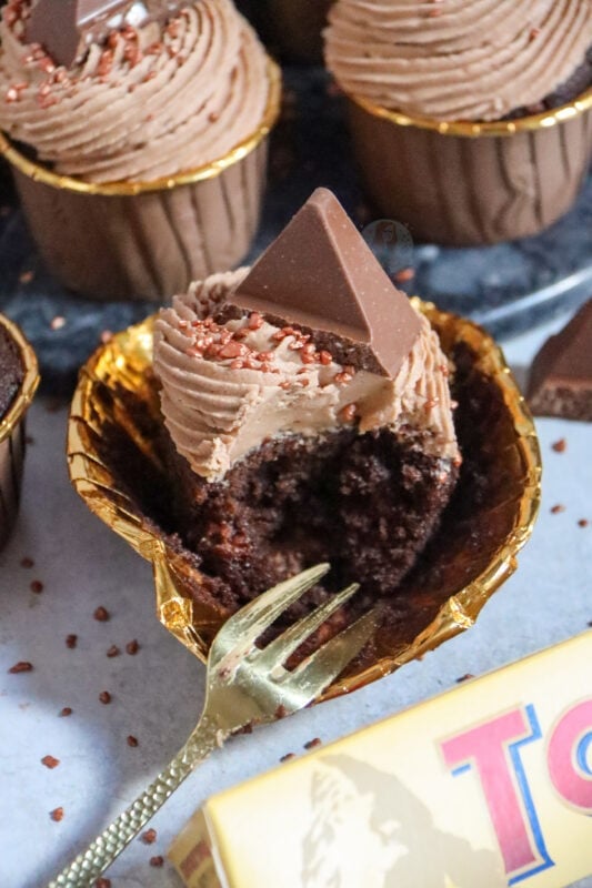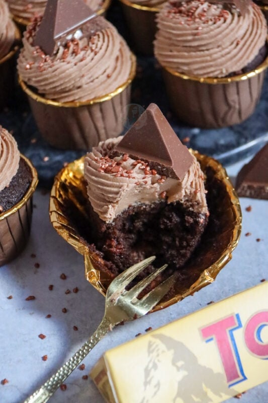 Delicious and chocolatey Toblerone cupcakes with Toblerone chunk sponges, Toblerone buttercream frosting, and Toblerone on top!